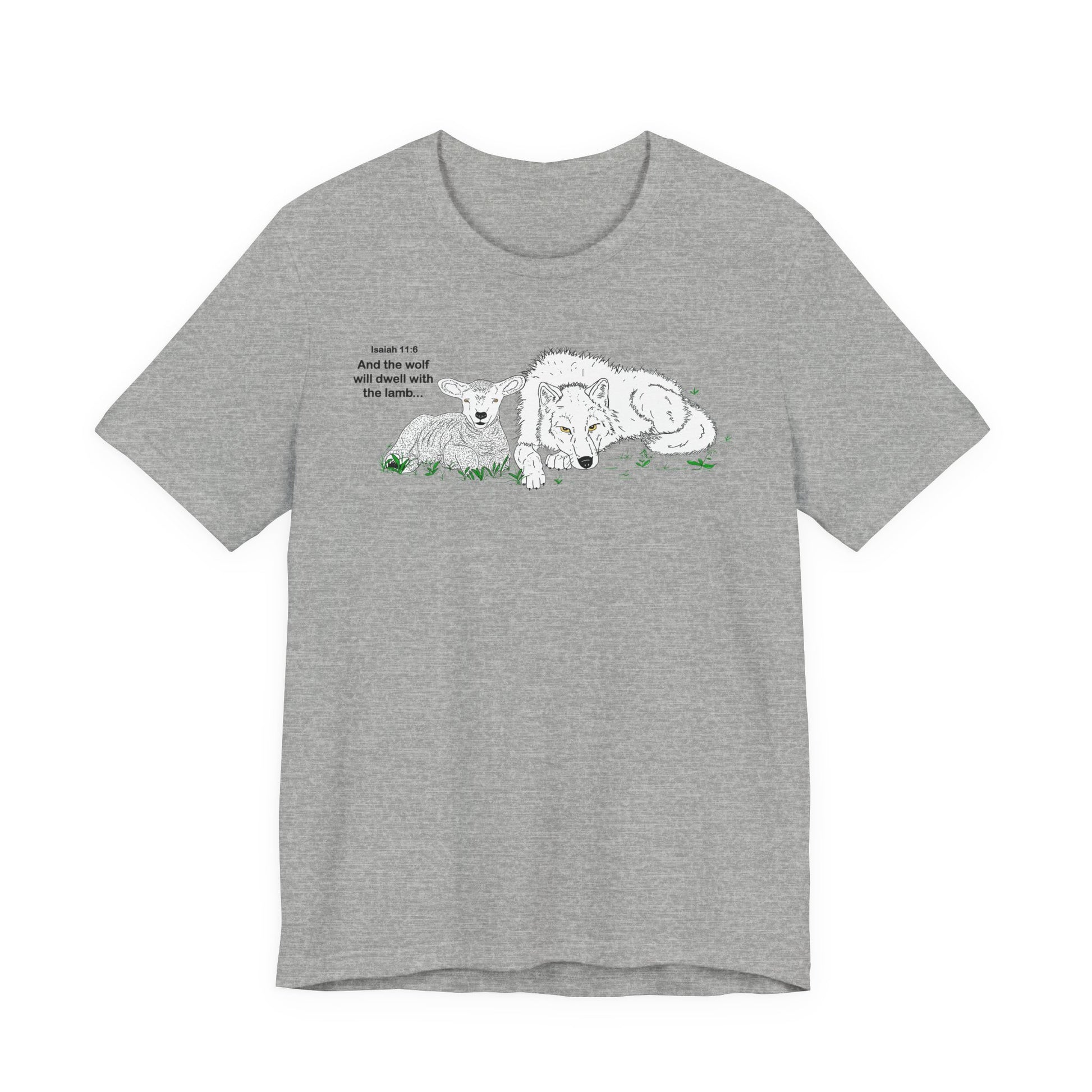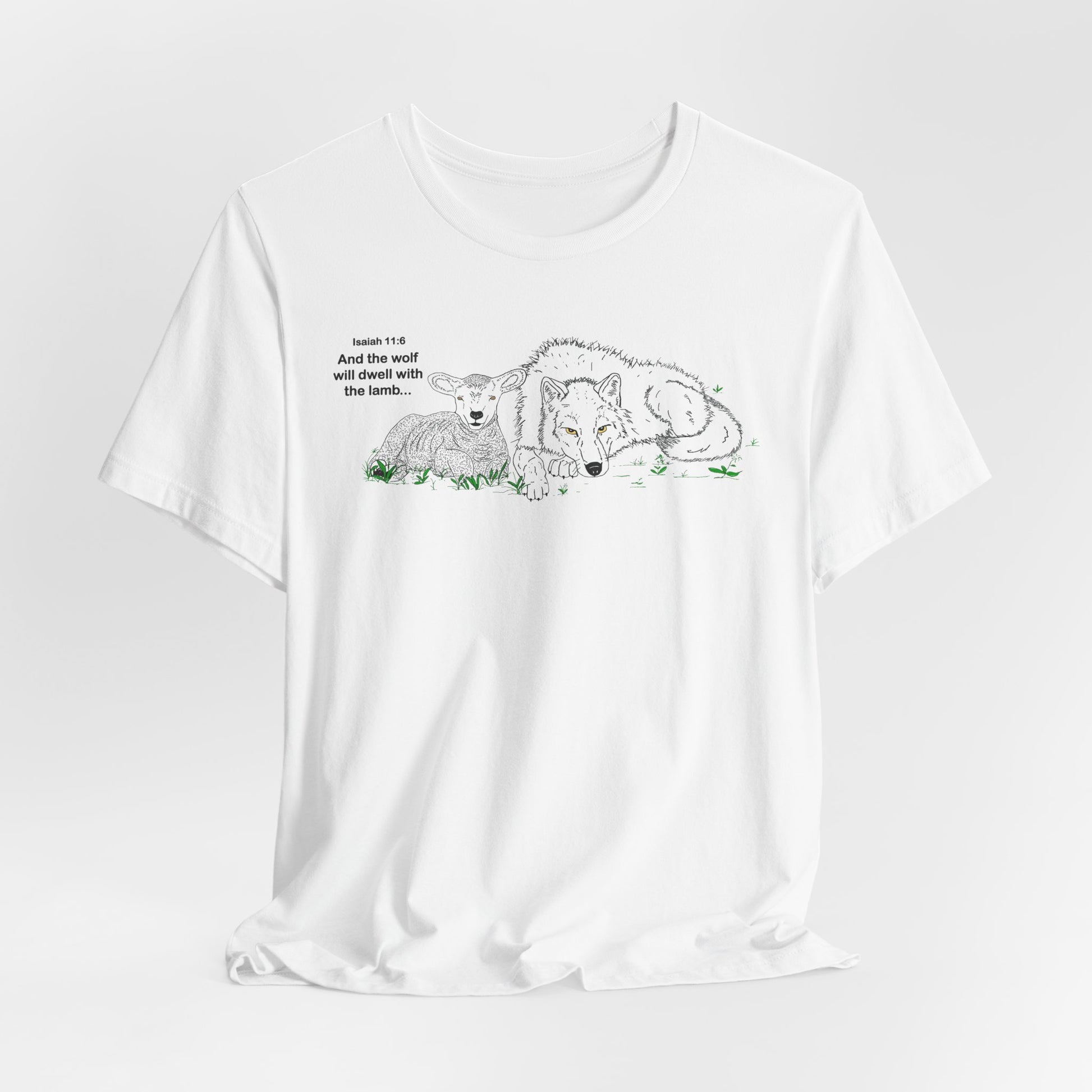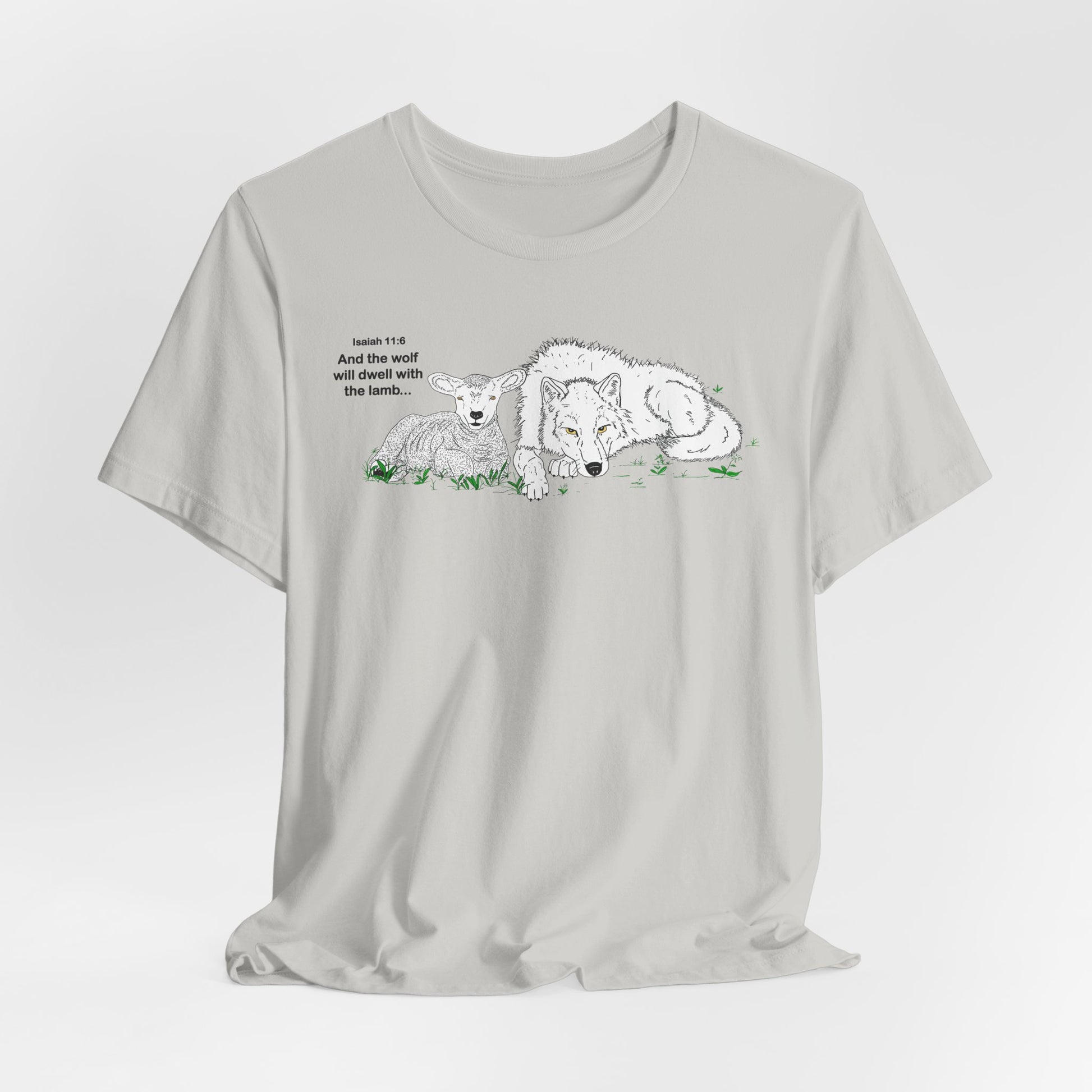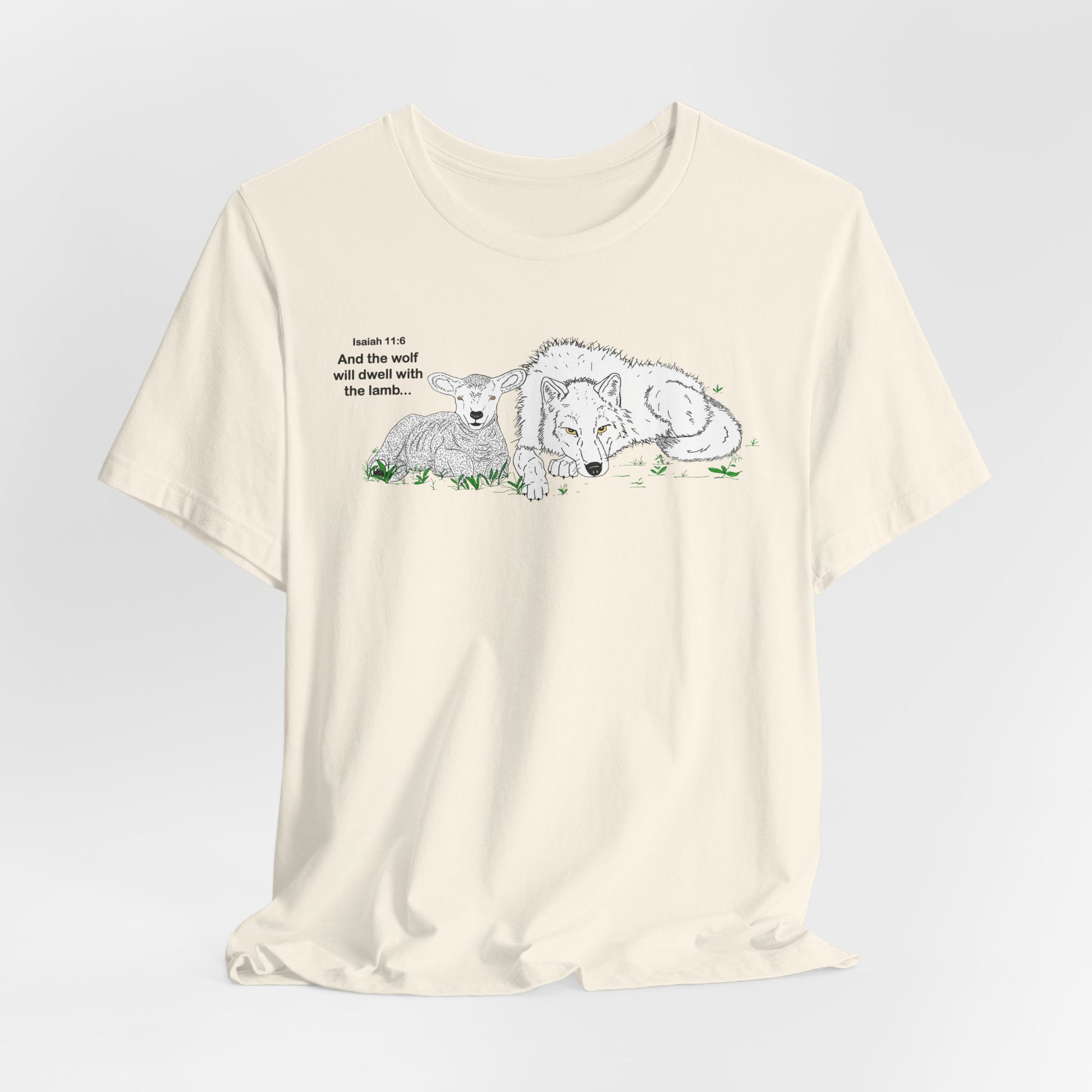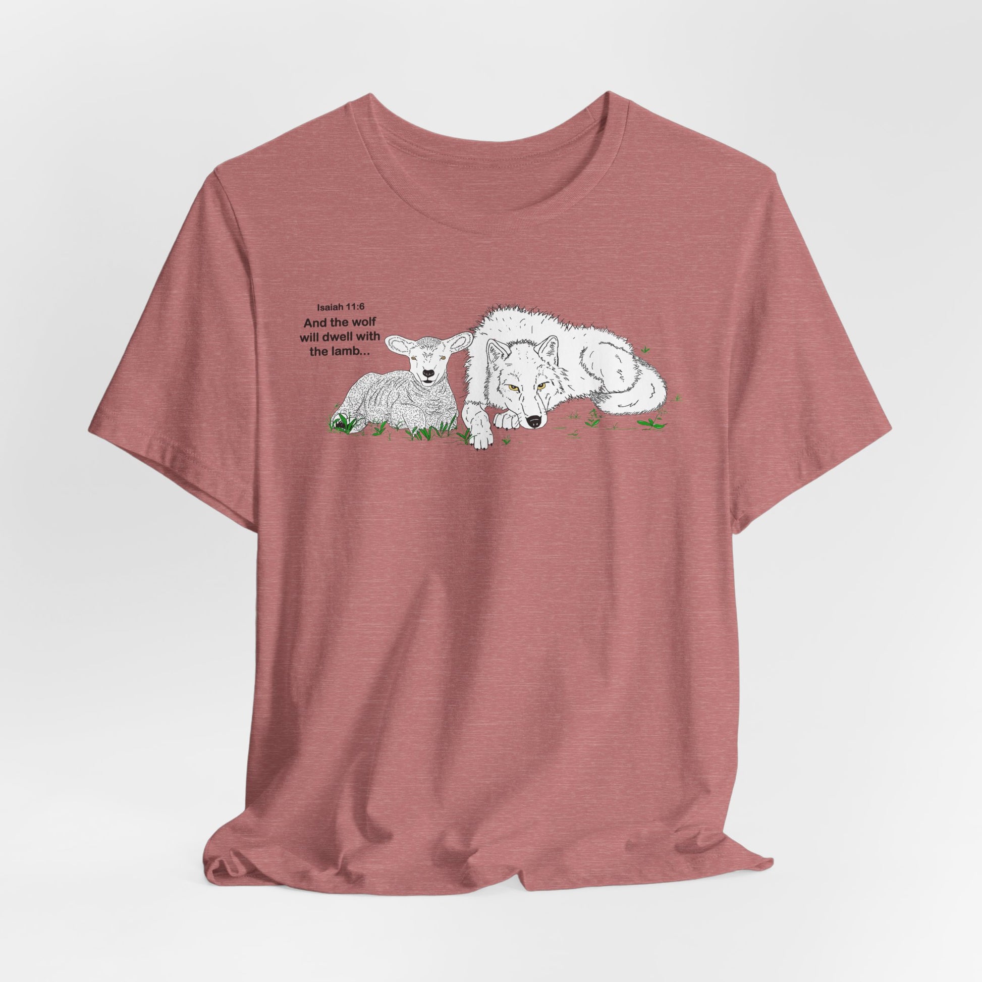 This lightweight crew tee features a delicate original line-art illustration of Wolf and Lamb, and a scripture verse from Isaiah 11:6