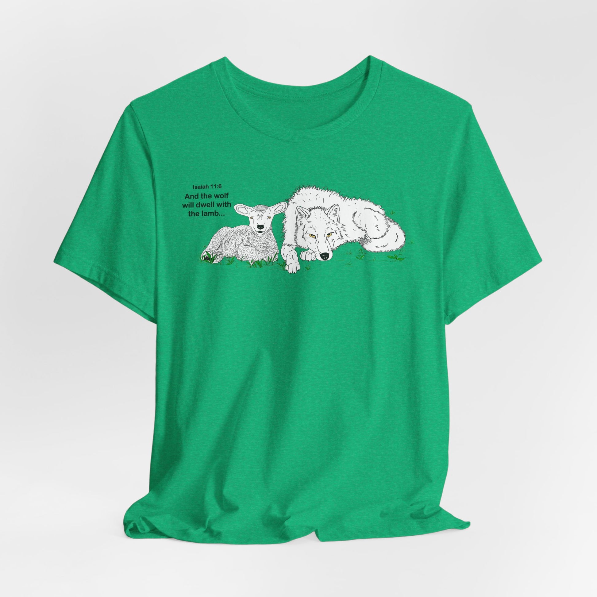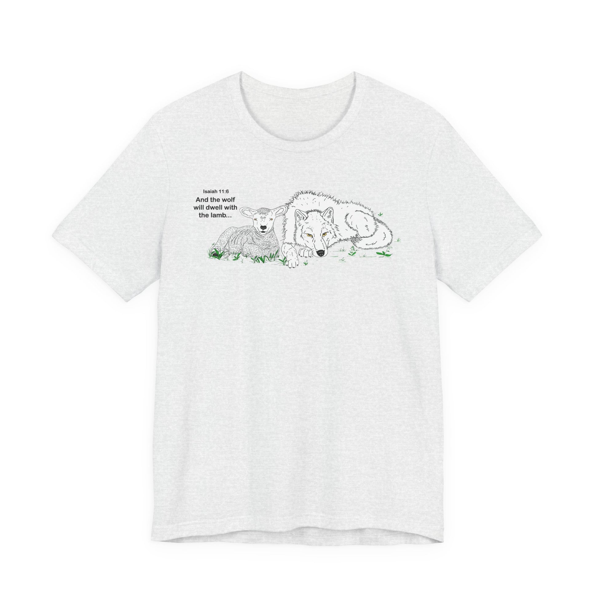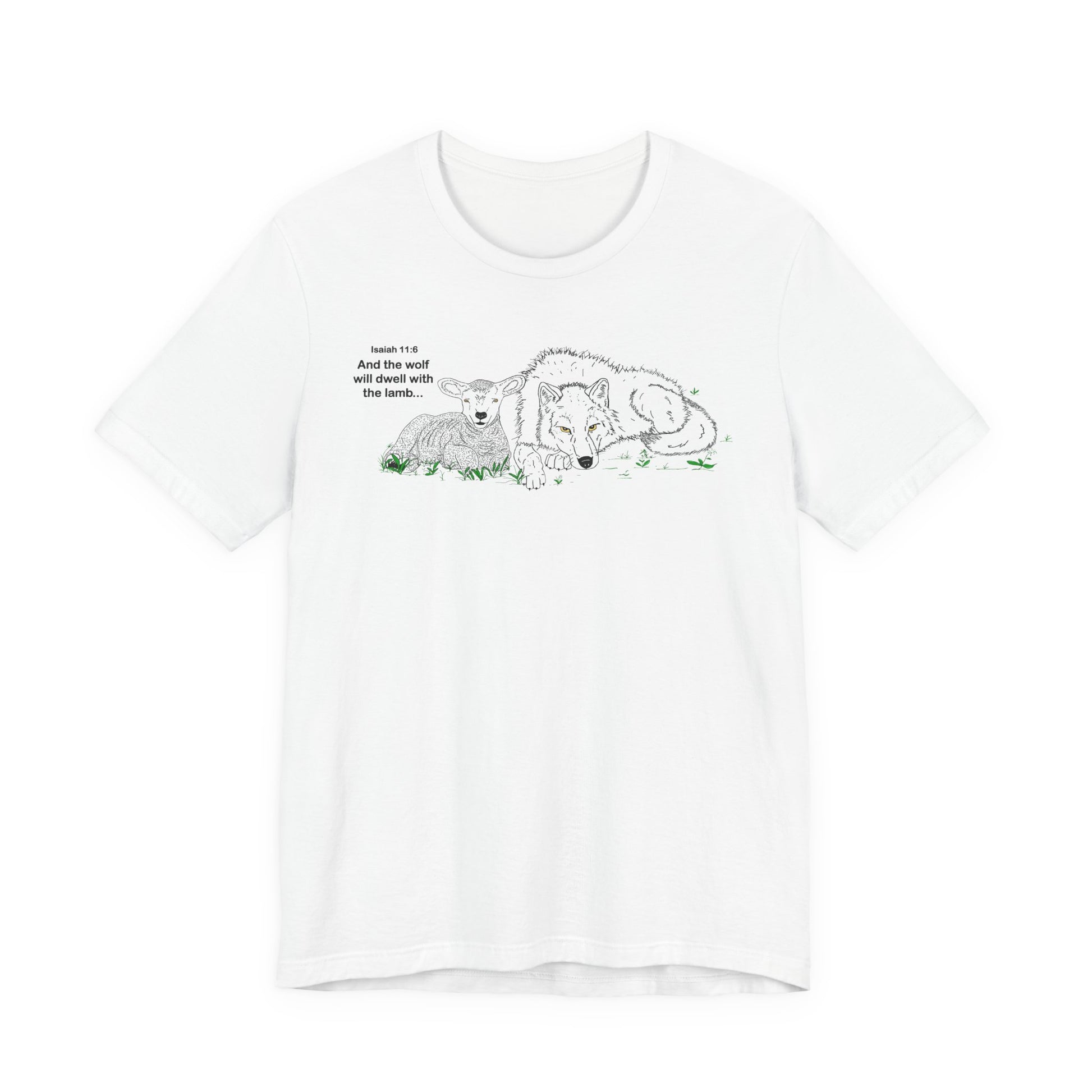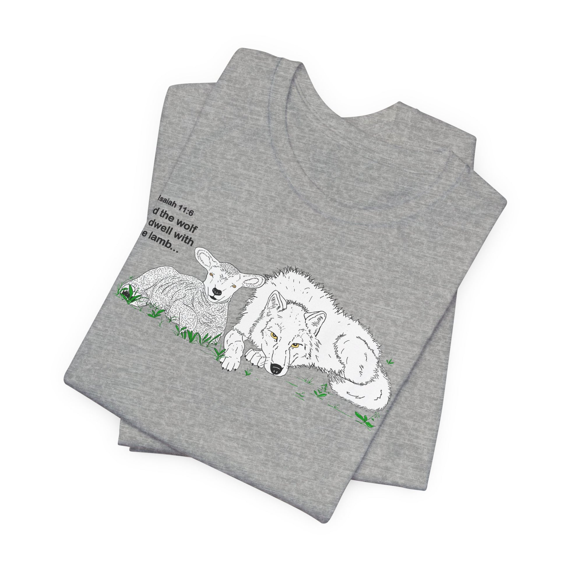 This lightweight crew tee features a delicate original line-art illustration of Wolf and Lamb, and a scripture verse from Isaiah 11:6