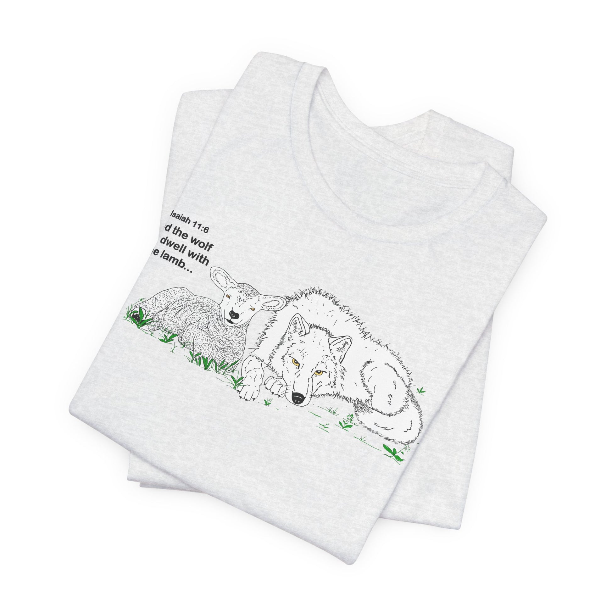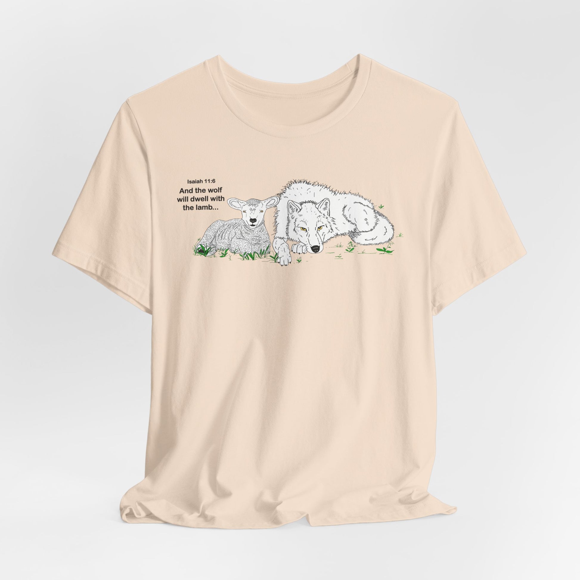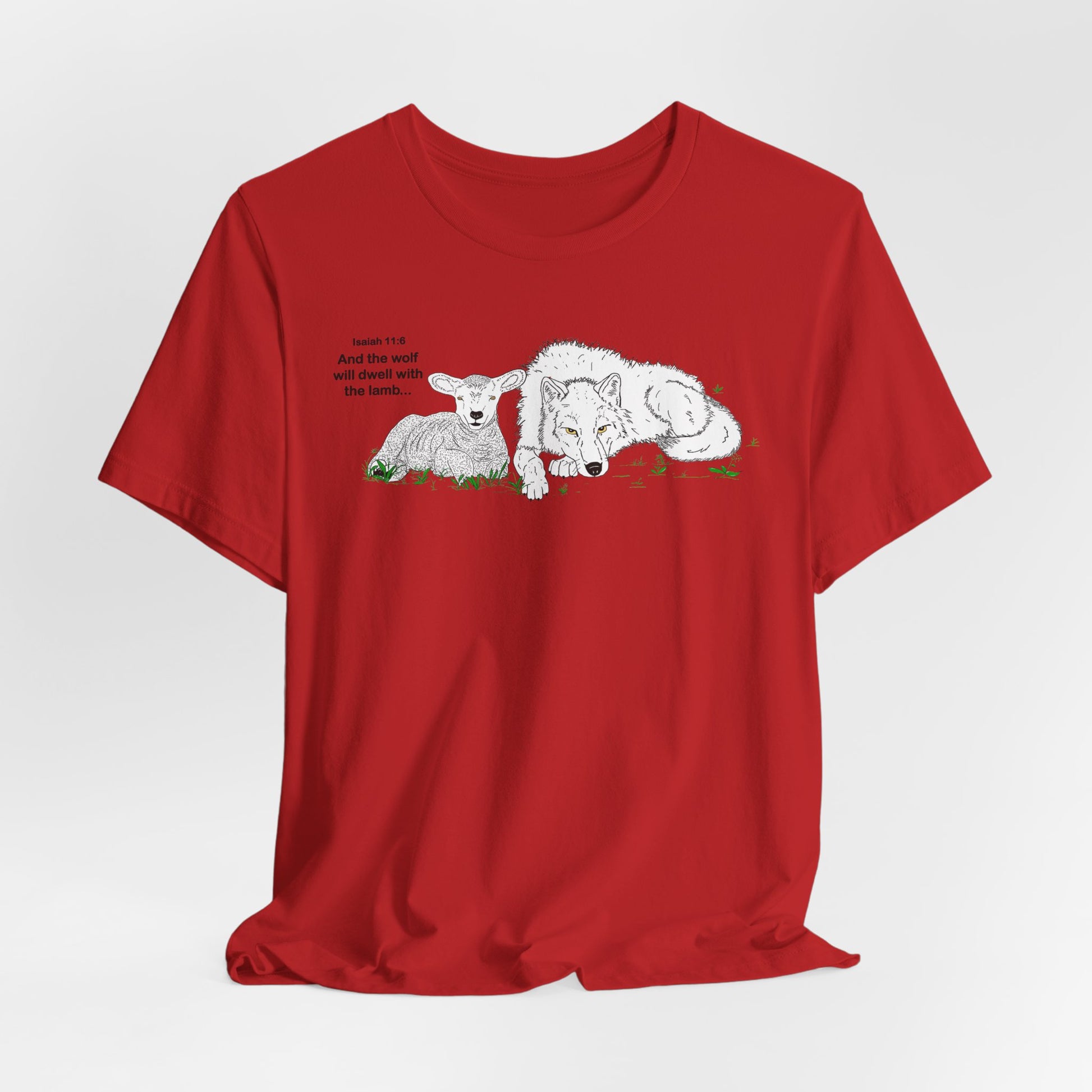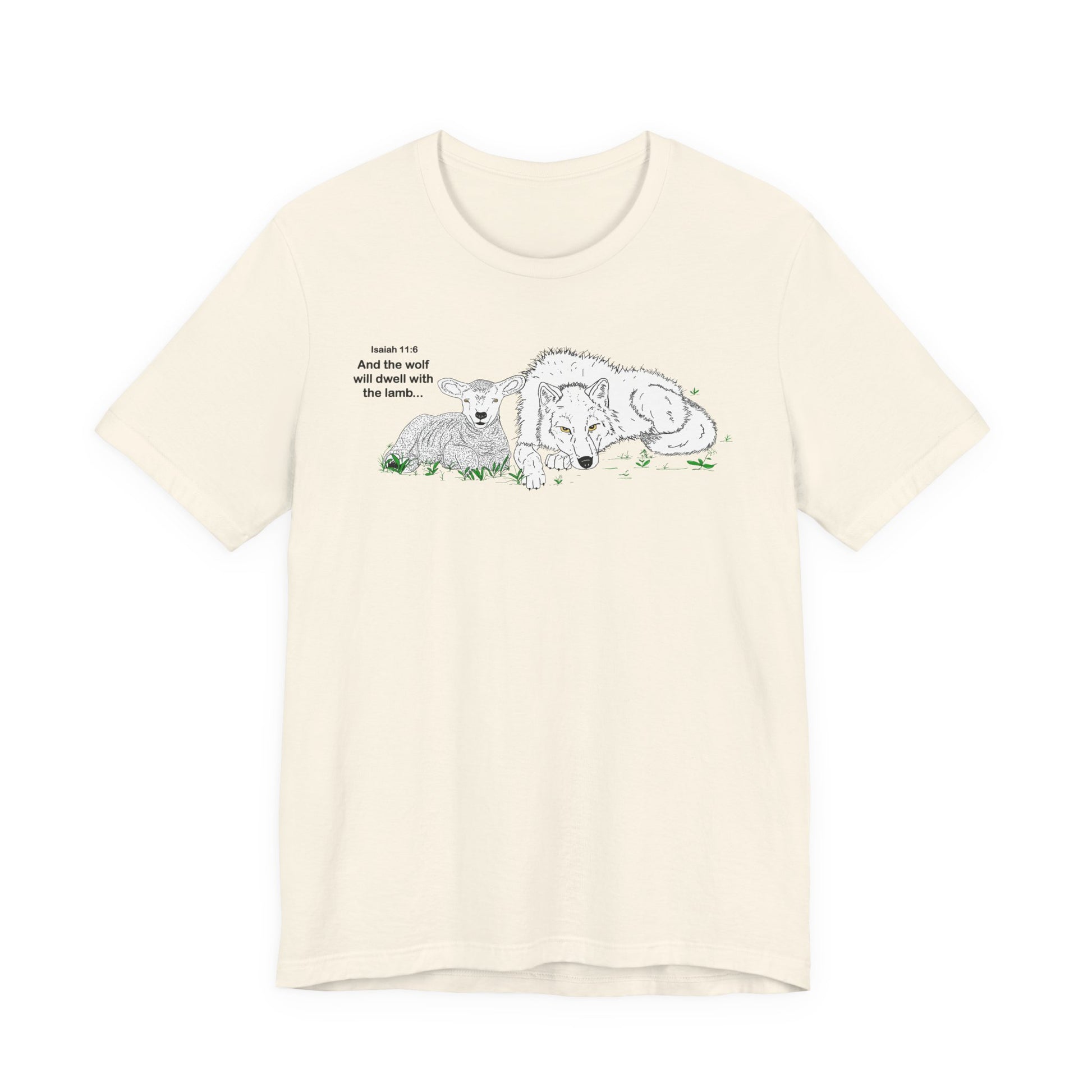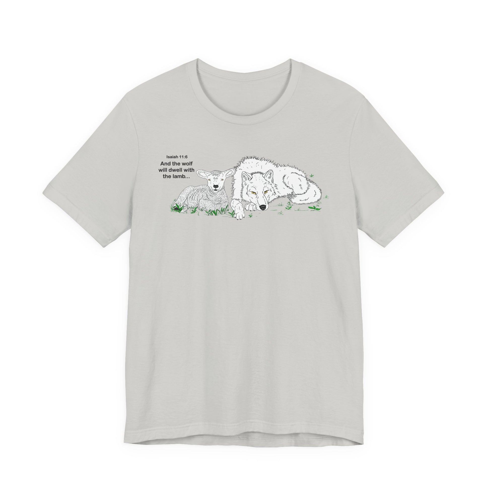 This lightweight crew tee features a delicate original line-art illustration of Wolf and Lamb, and a scripture verse from Isaiah 11:6
