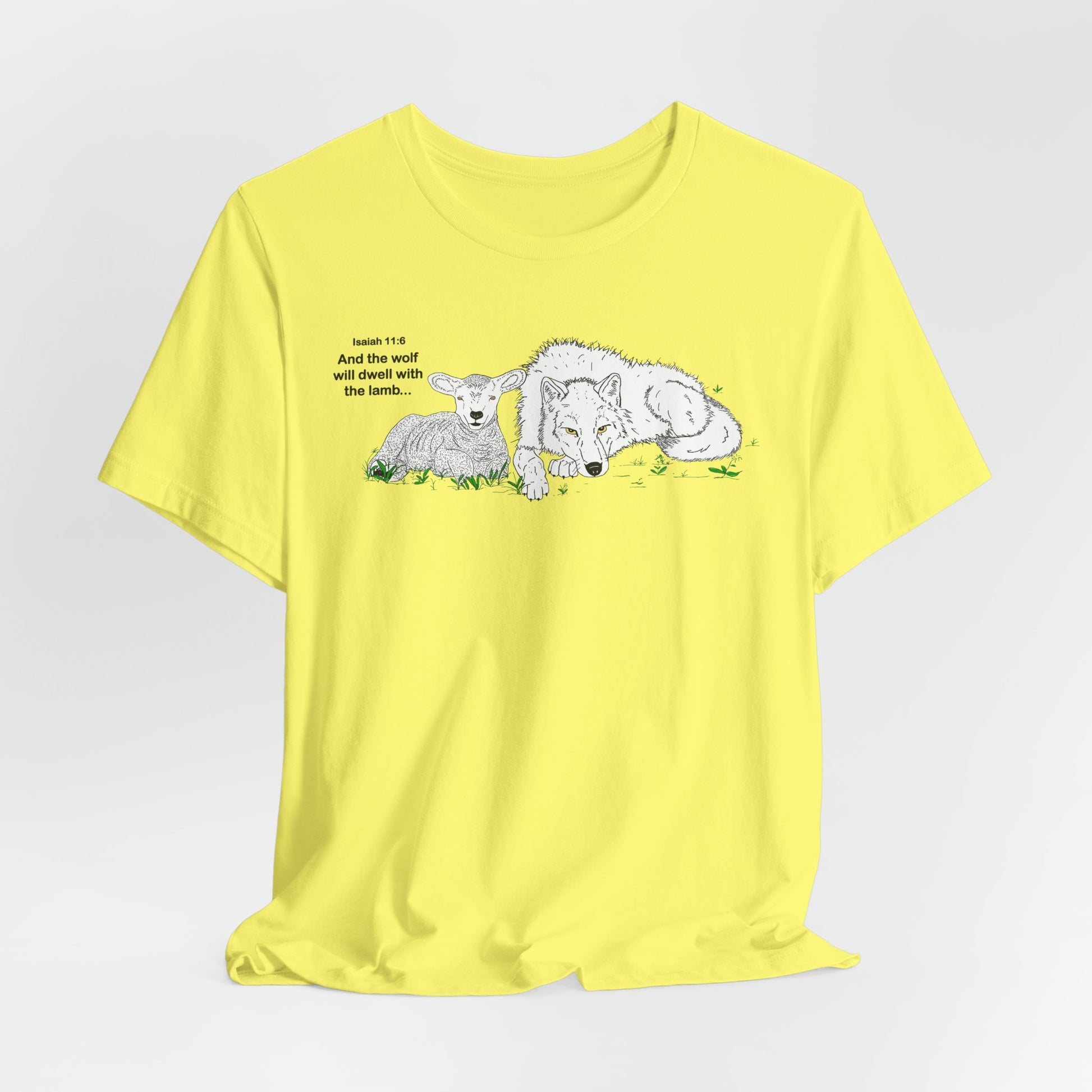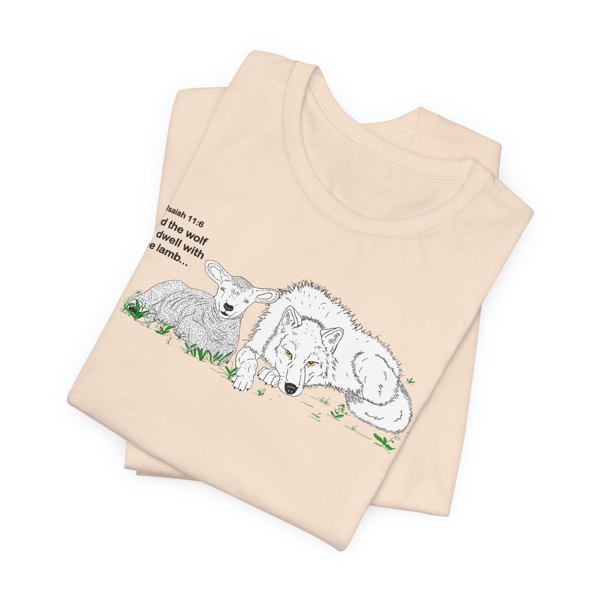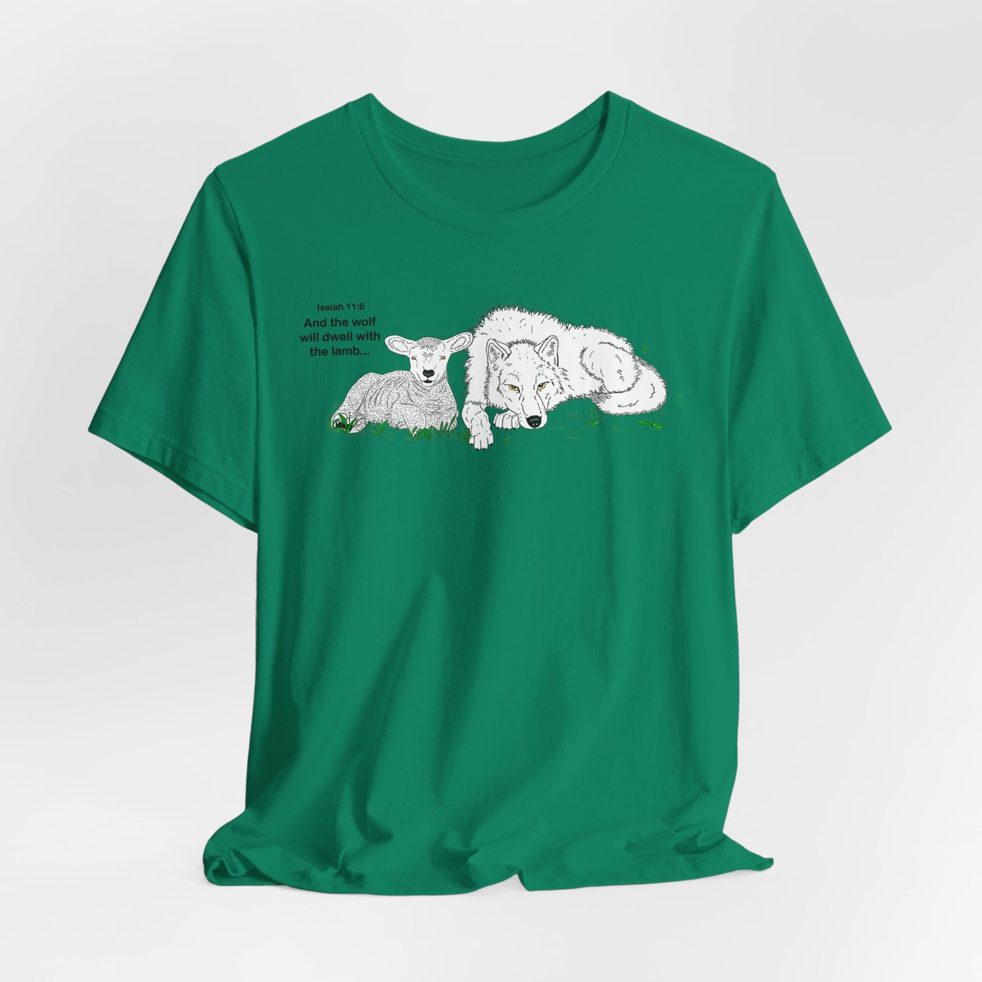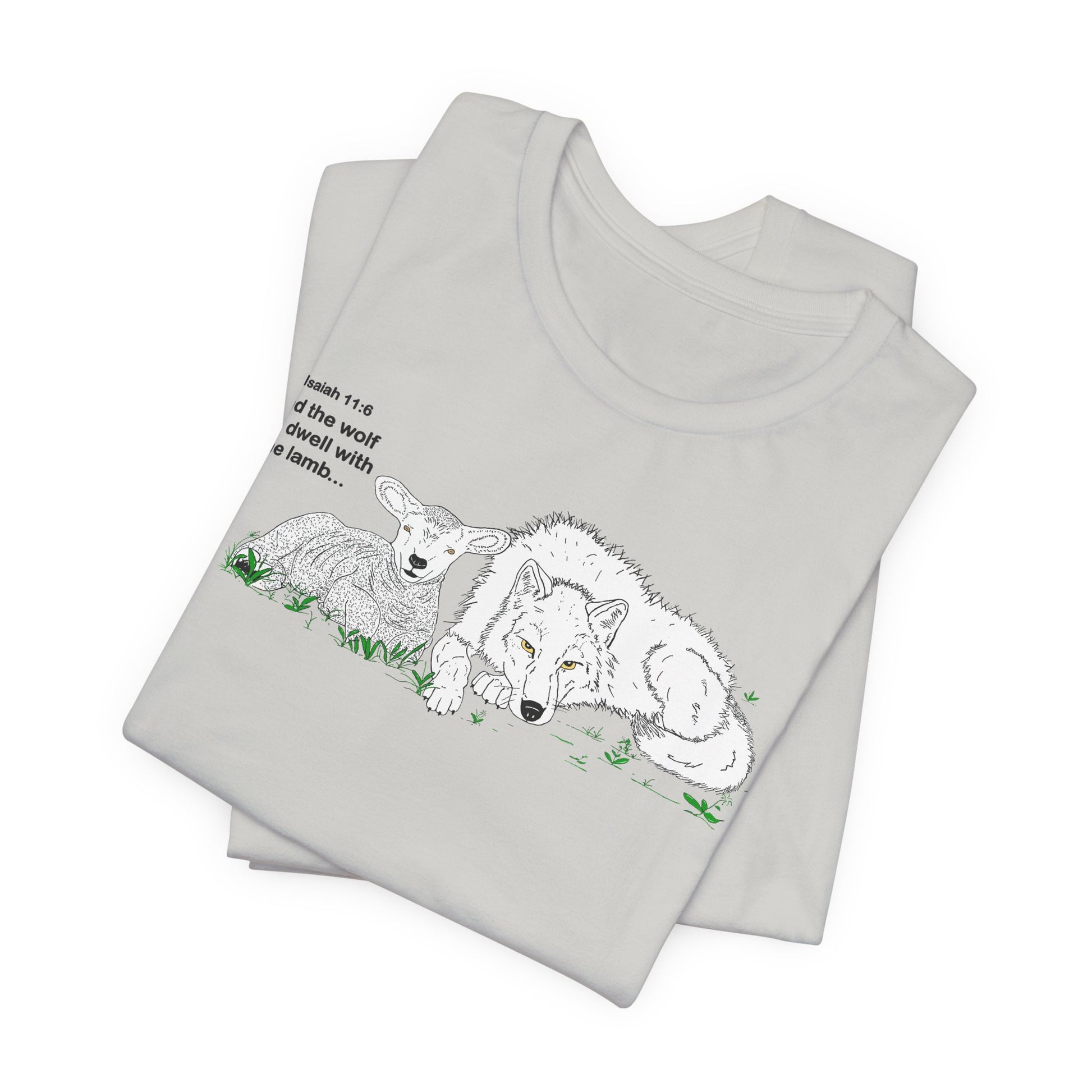 This lightweight crew tee features a delicate original line-art illustration of Wolf and Lamb, and a scripture verse from Isaiah 11:6
