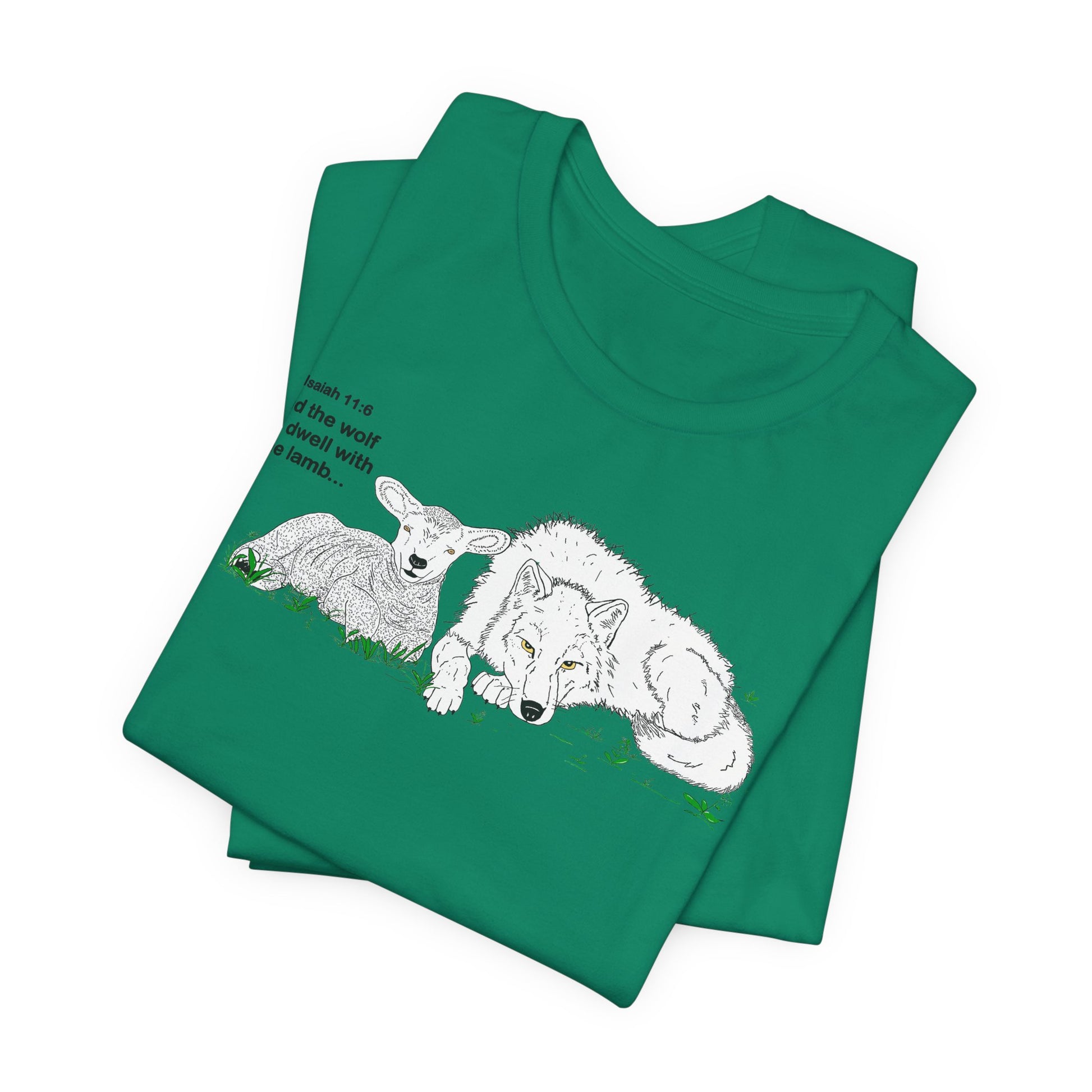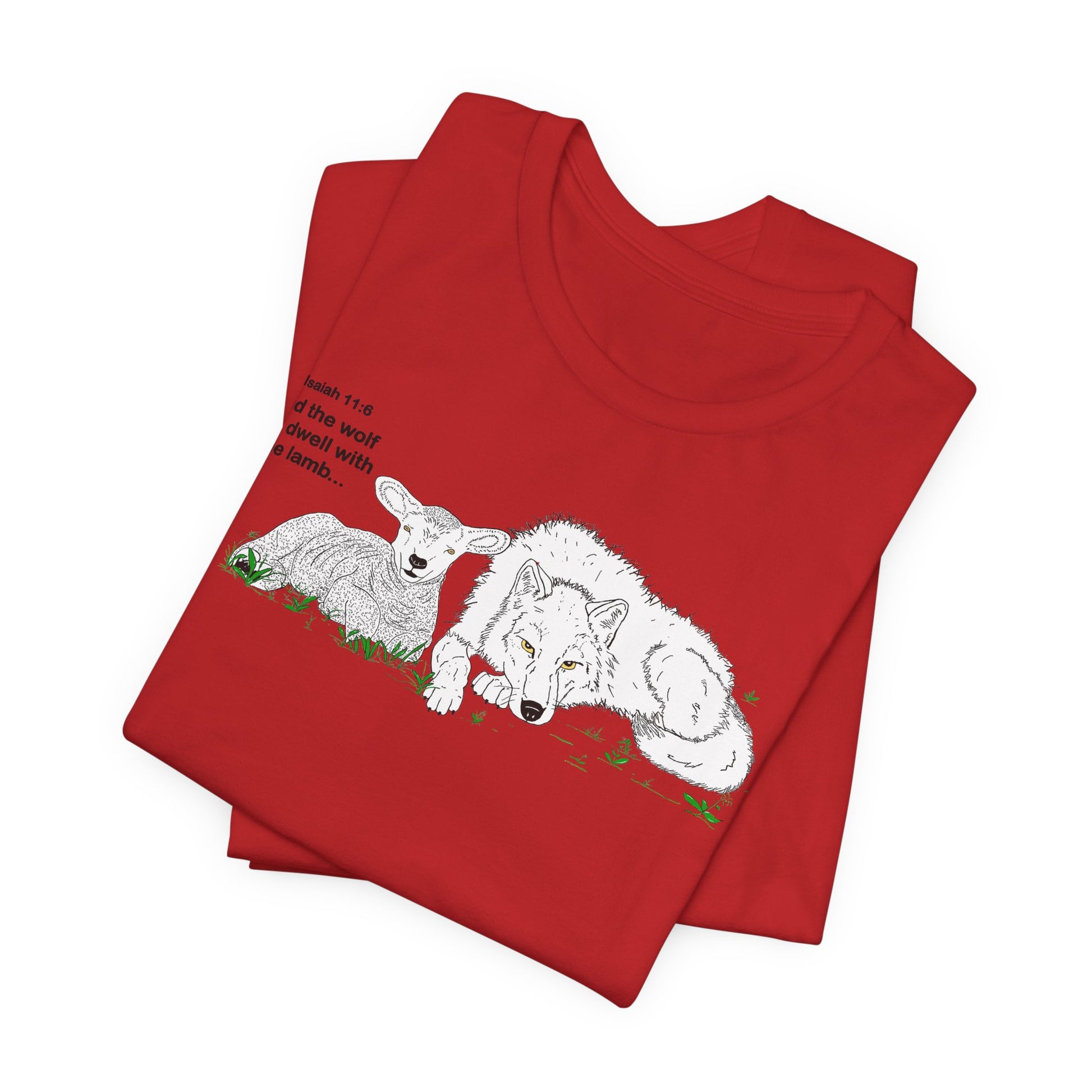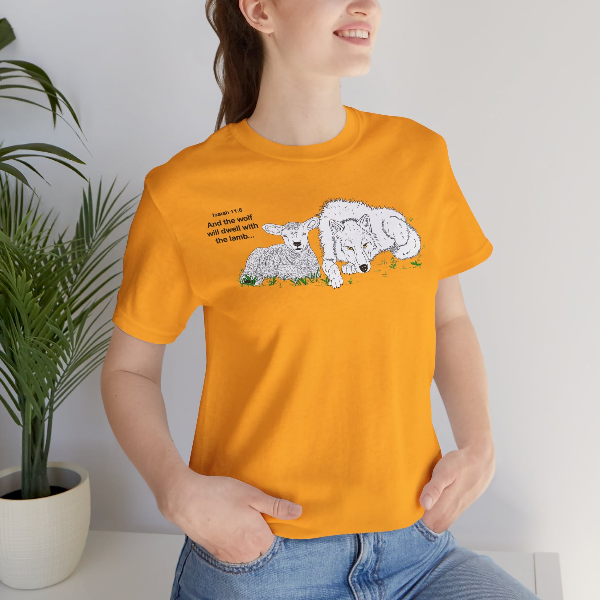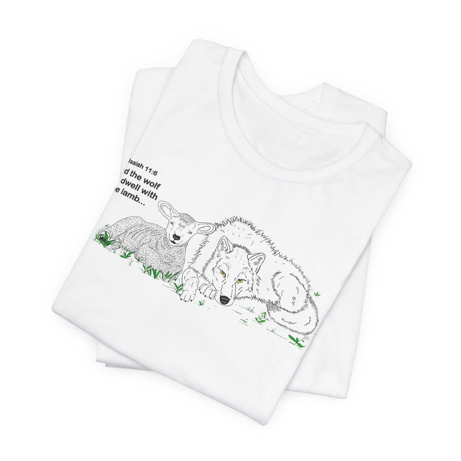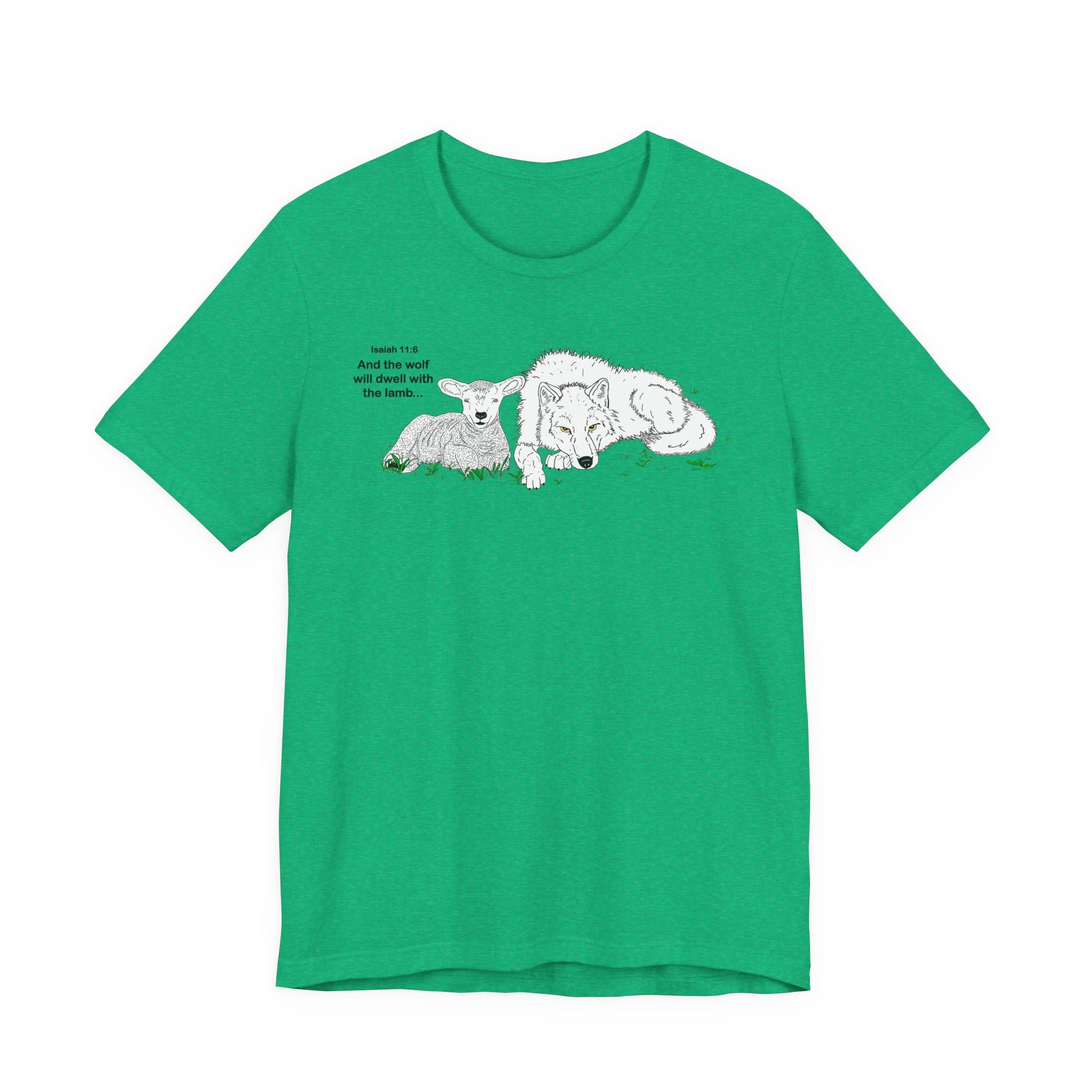 This lightweight crew tee features a delicate original line-art illustration of Wolf and Lamb, and a scripture verse from Isaiah 11:6