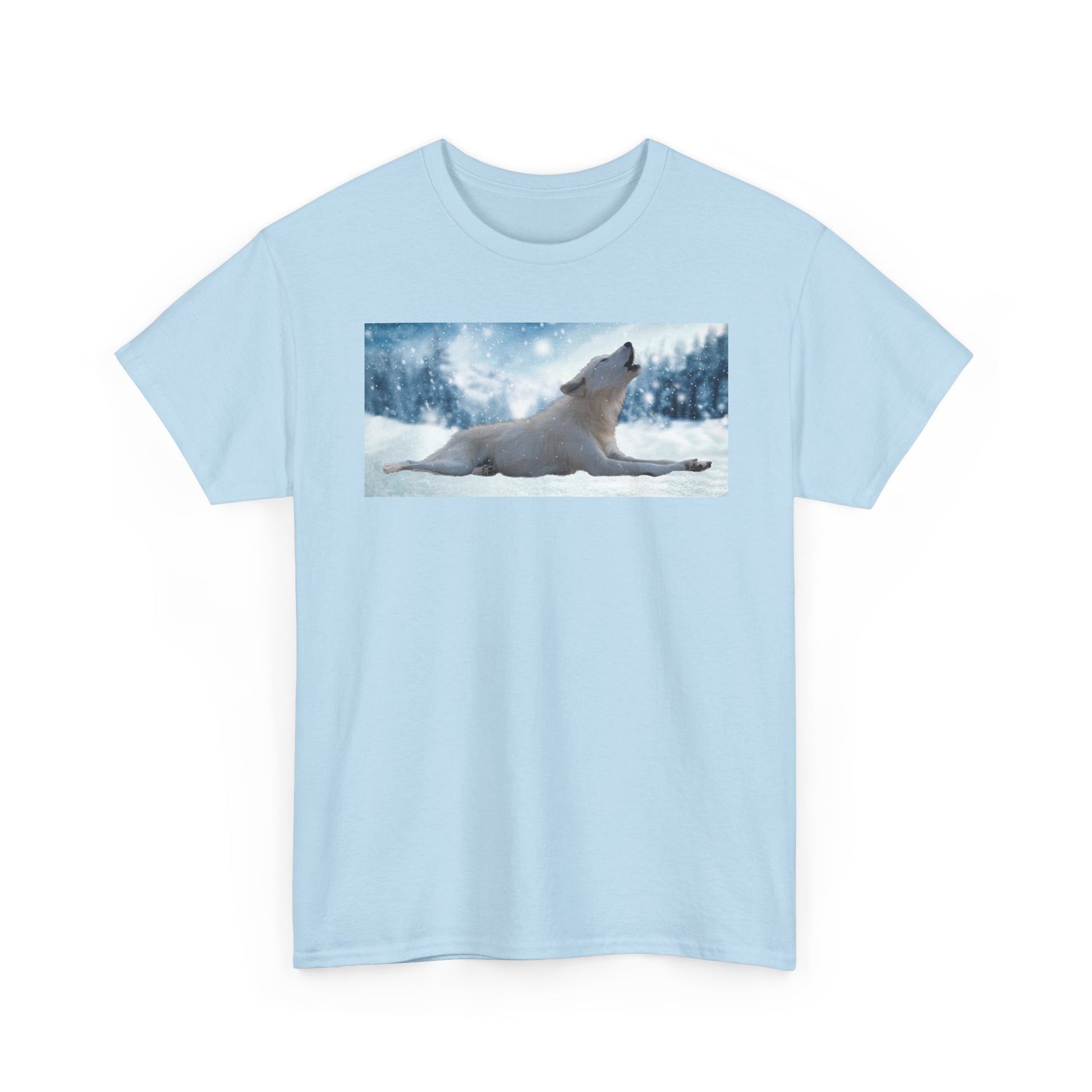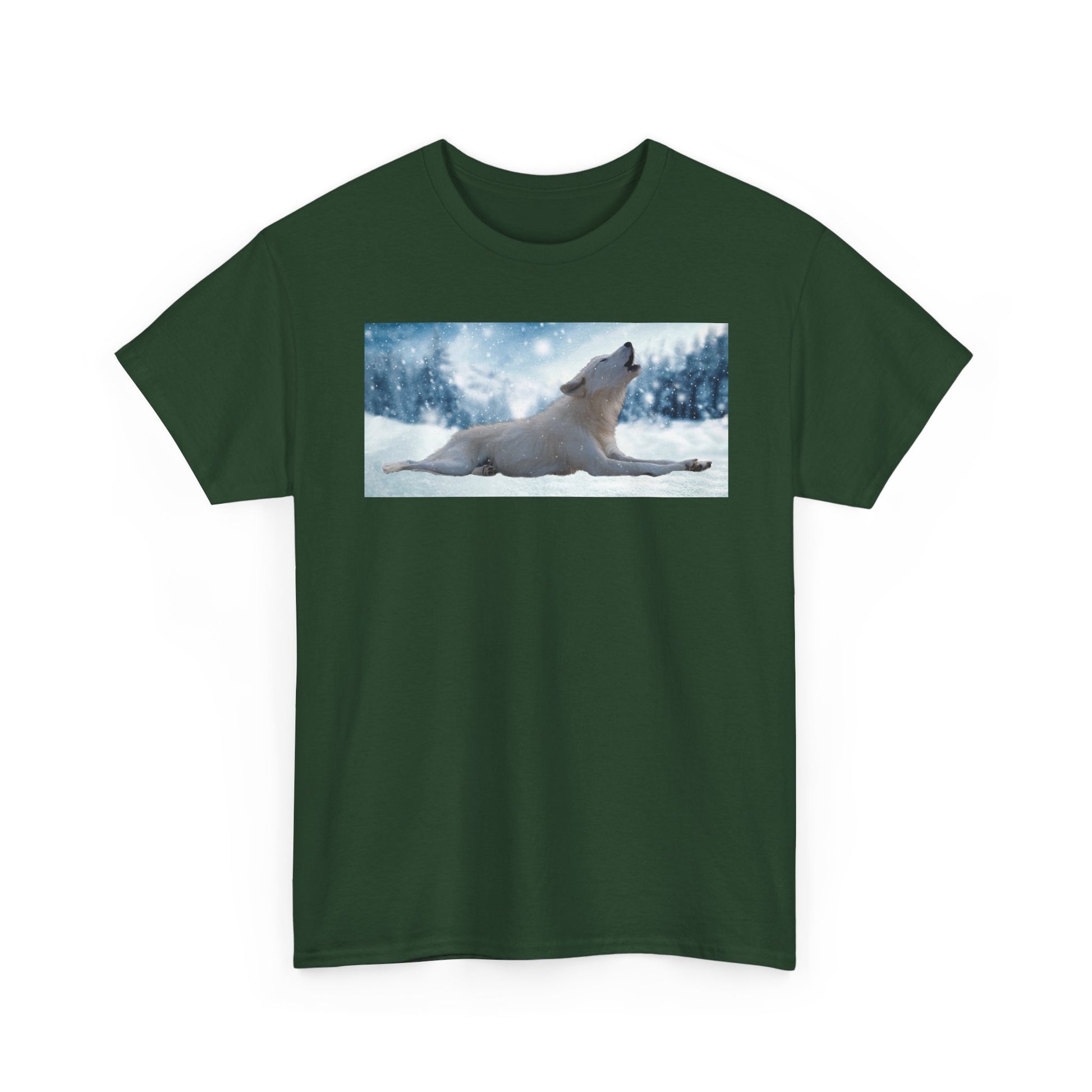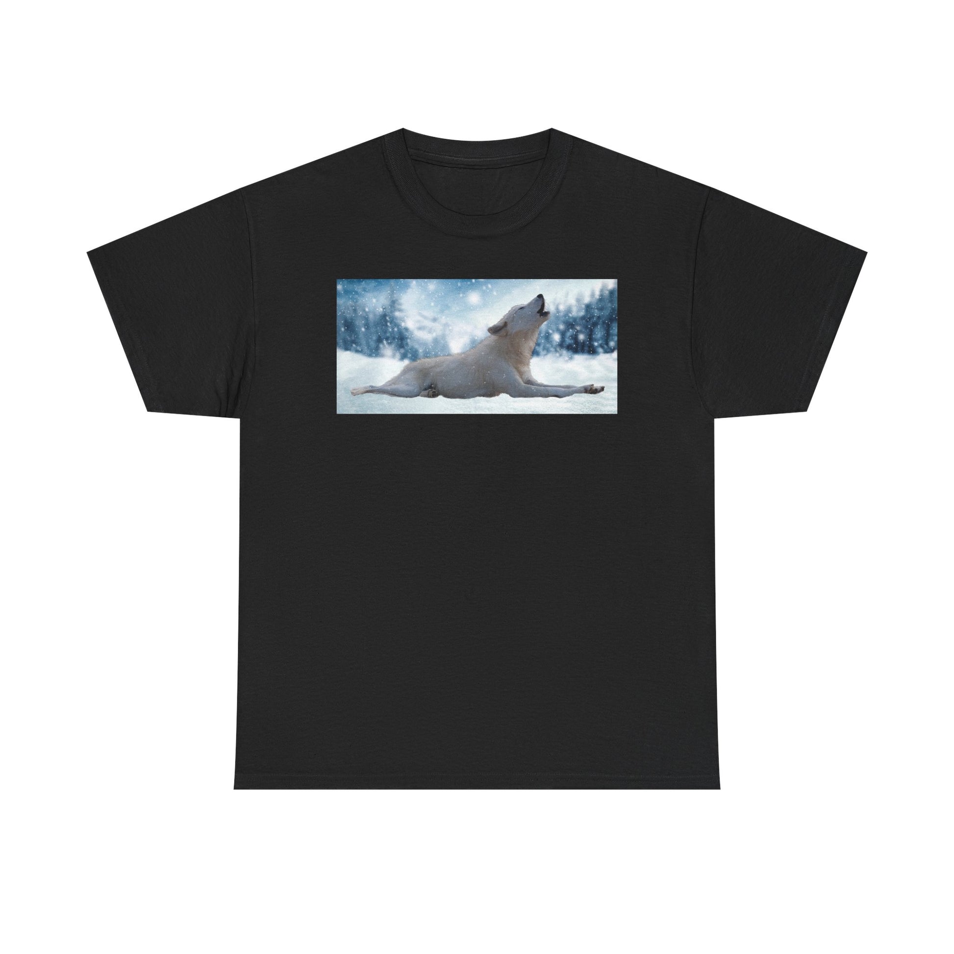 A relaxed, sturdy cotton tee that carries a quiet, wintry story. This print of a lone wolf resting in a snowy forest clearing — cool blues, frosted pines, and misted breath bring a calm, outdoorsy mood. Wear it on chilly mornings with a flannel over it or layered under a field jacket. It reads like a subtle nod to wilderness wanderers and night-drivers who love quiet landscapes and still, snowy roads. The design sits low on the chest for a modern, understated look that won’t shout but will start conversations with fellow nature lovers.