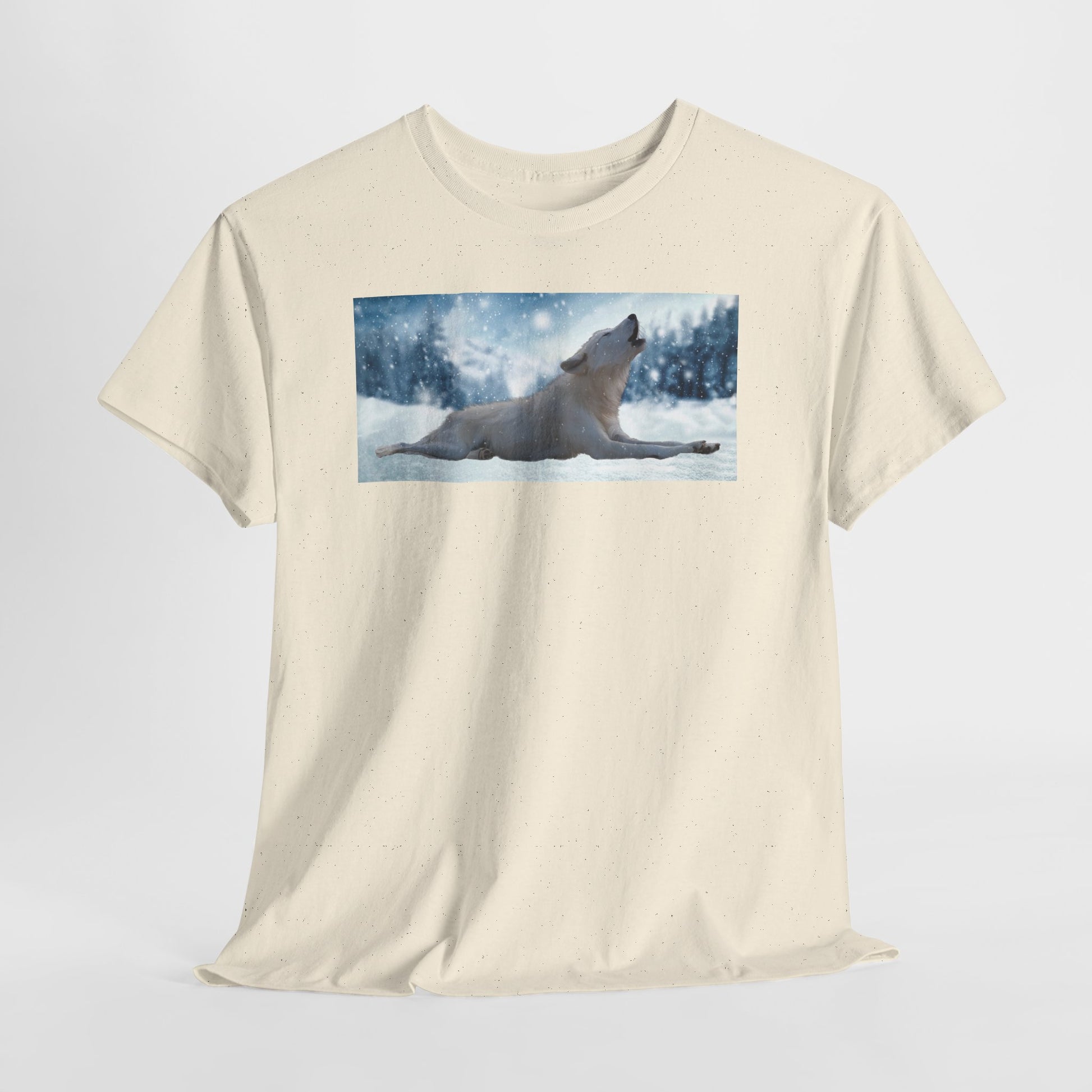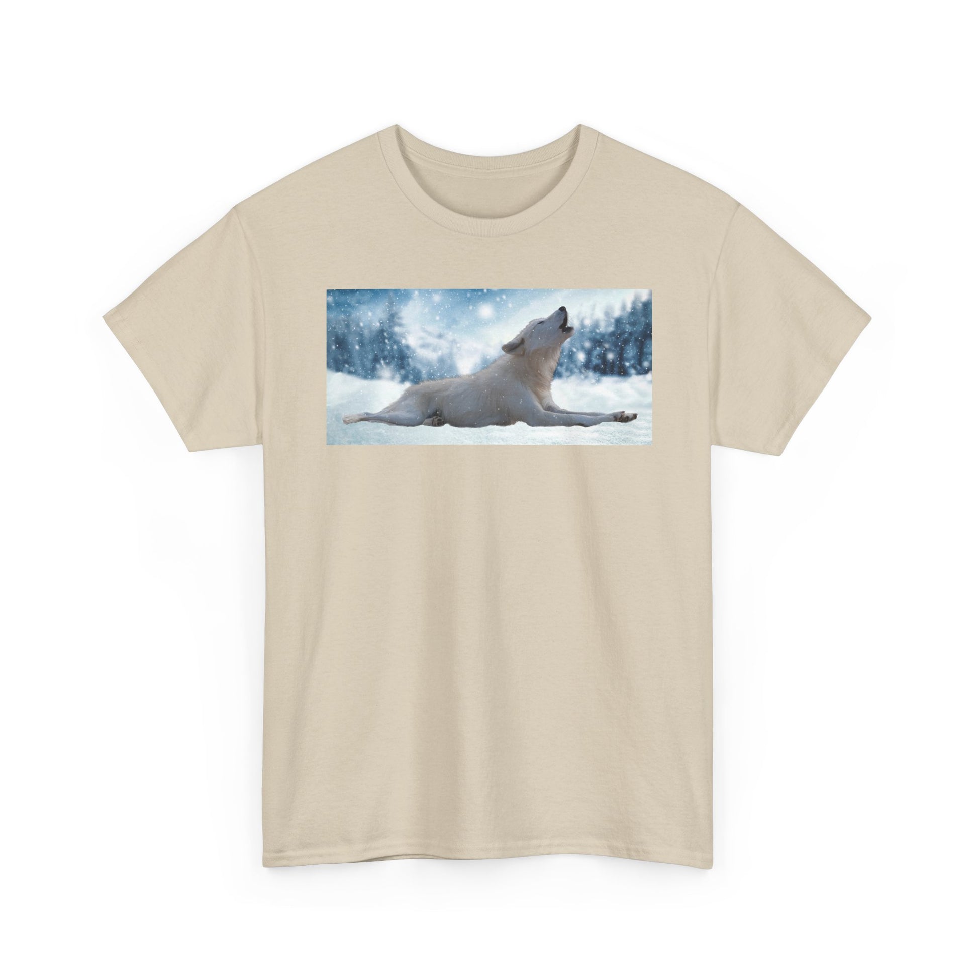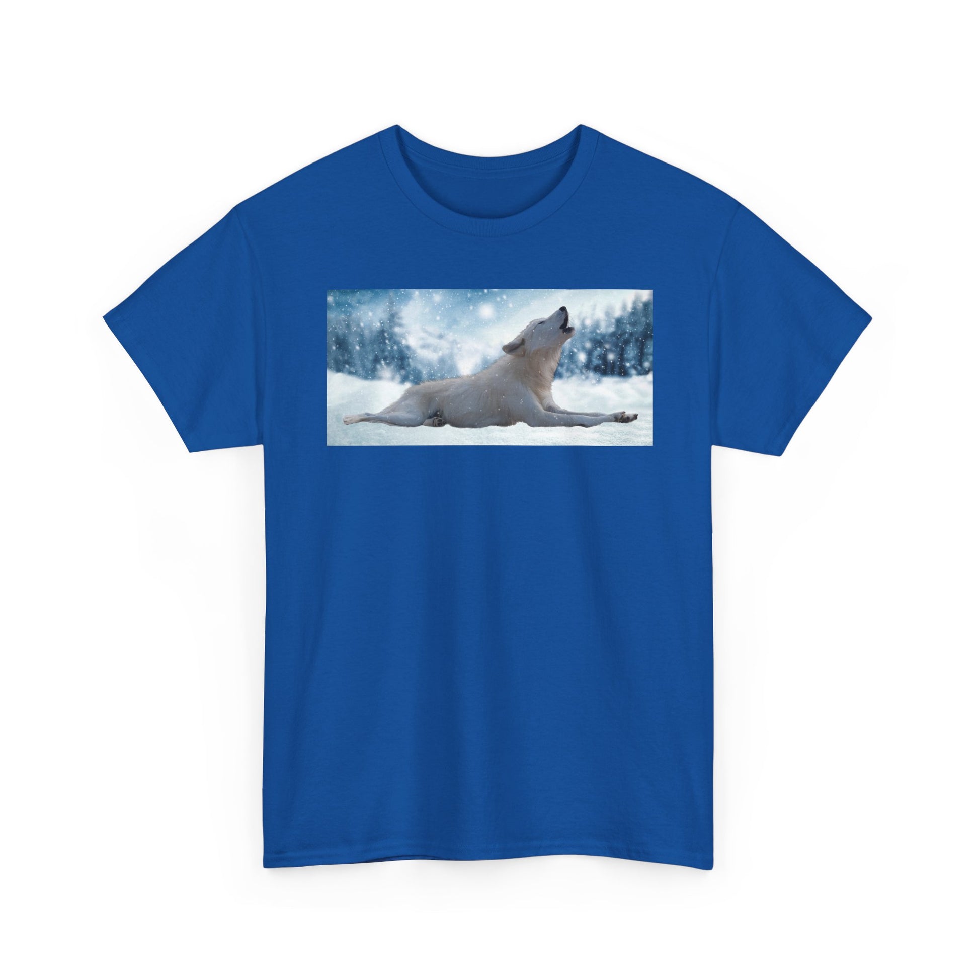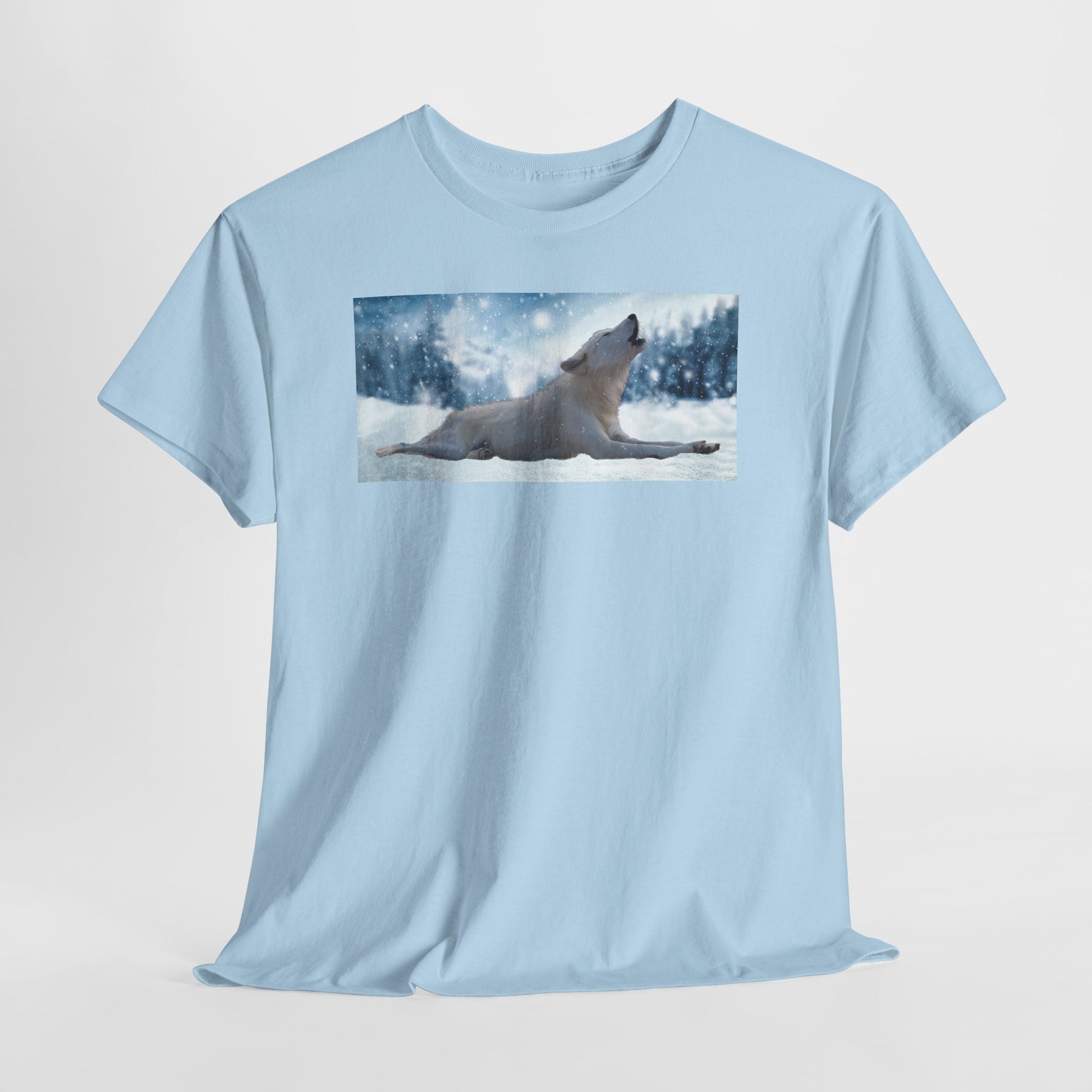 A relaxed, sturdy cotton tee that carries a quiet, wintry story. This print of a lone wolf resting in a snowy forest clearing — cool blues, frosted pines, and misted breath bring a calm, outdoorsy mood. Wear it on chilly mornings with a flannel over it or layered under a field jacket. It reads like a subtle nod to wilderness wanderers and night-drivers who love quiet landscapes and still, snowy roads. The design sits low on the chest for a modern, understated look that won’t shout but will start conversations with fellow nature lovers.