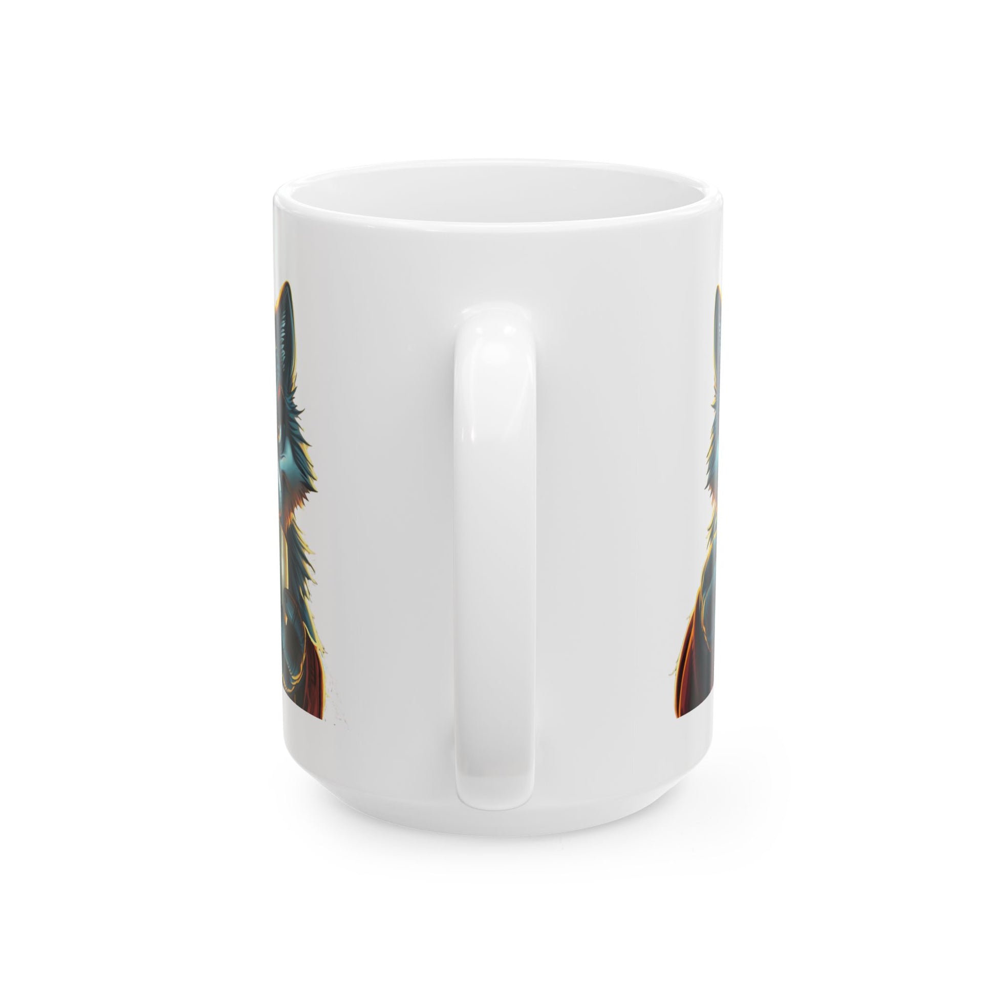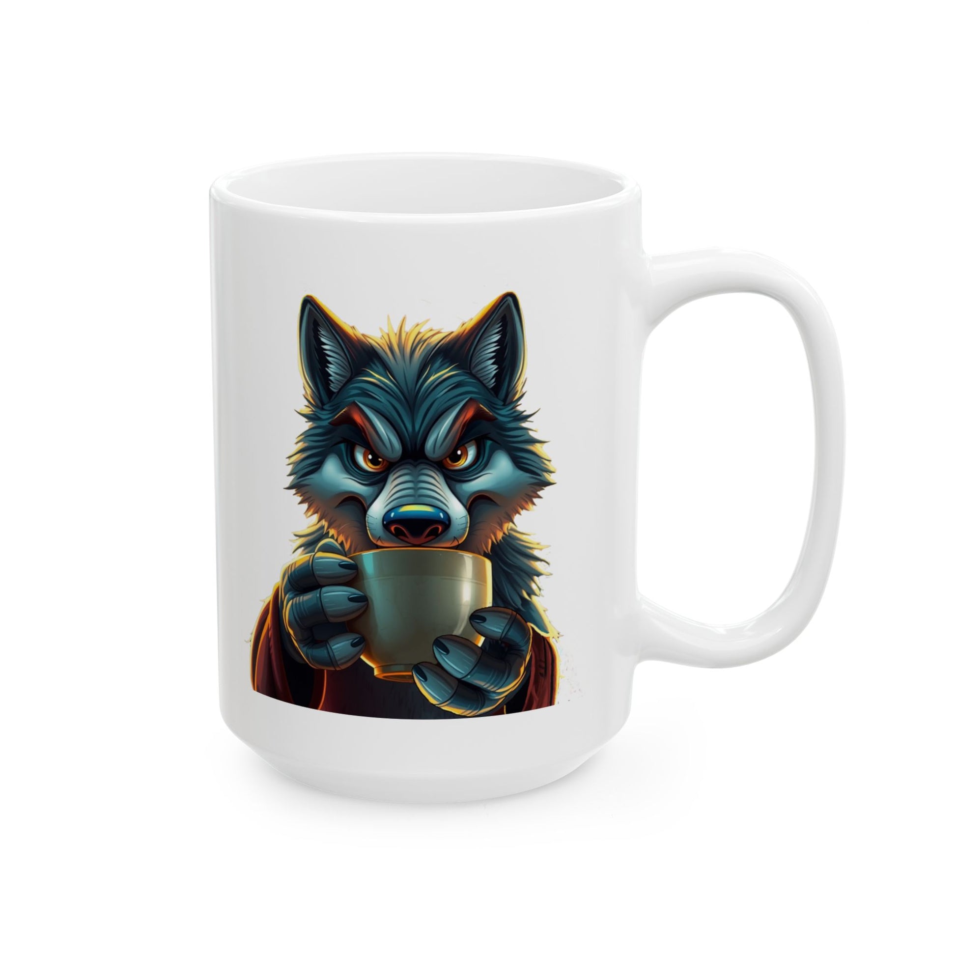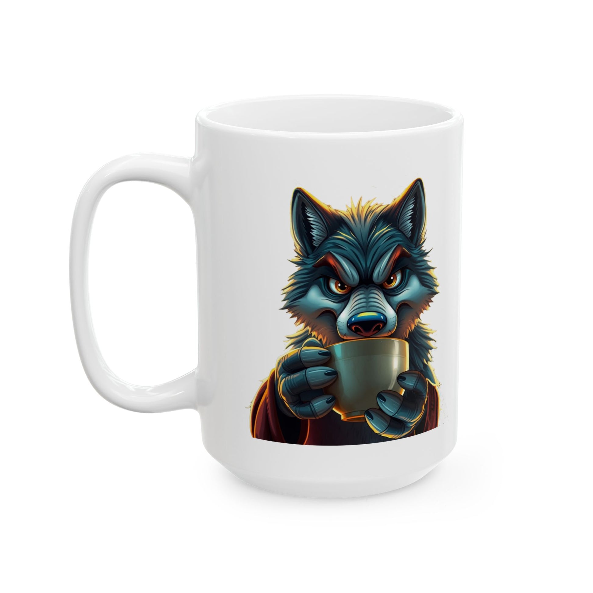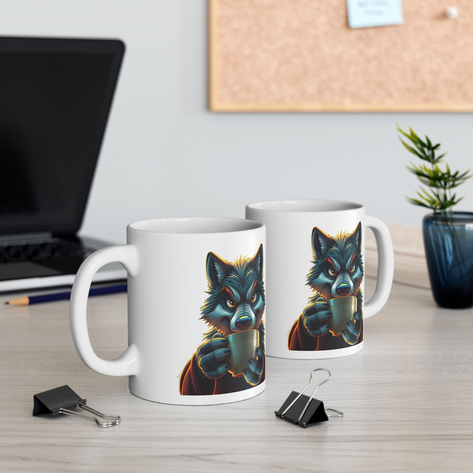 With eyes that burn like sunrise and fur lit up like he stepped out of a comic-book universe, this wolf grips his mug with the intensity of someone who knows the entire day depends on the next sip.
