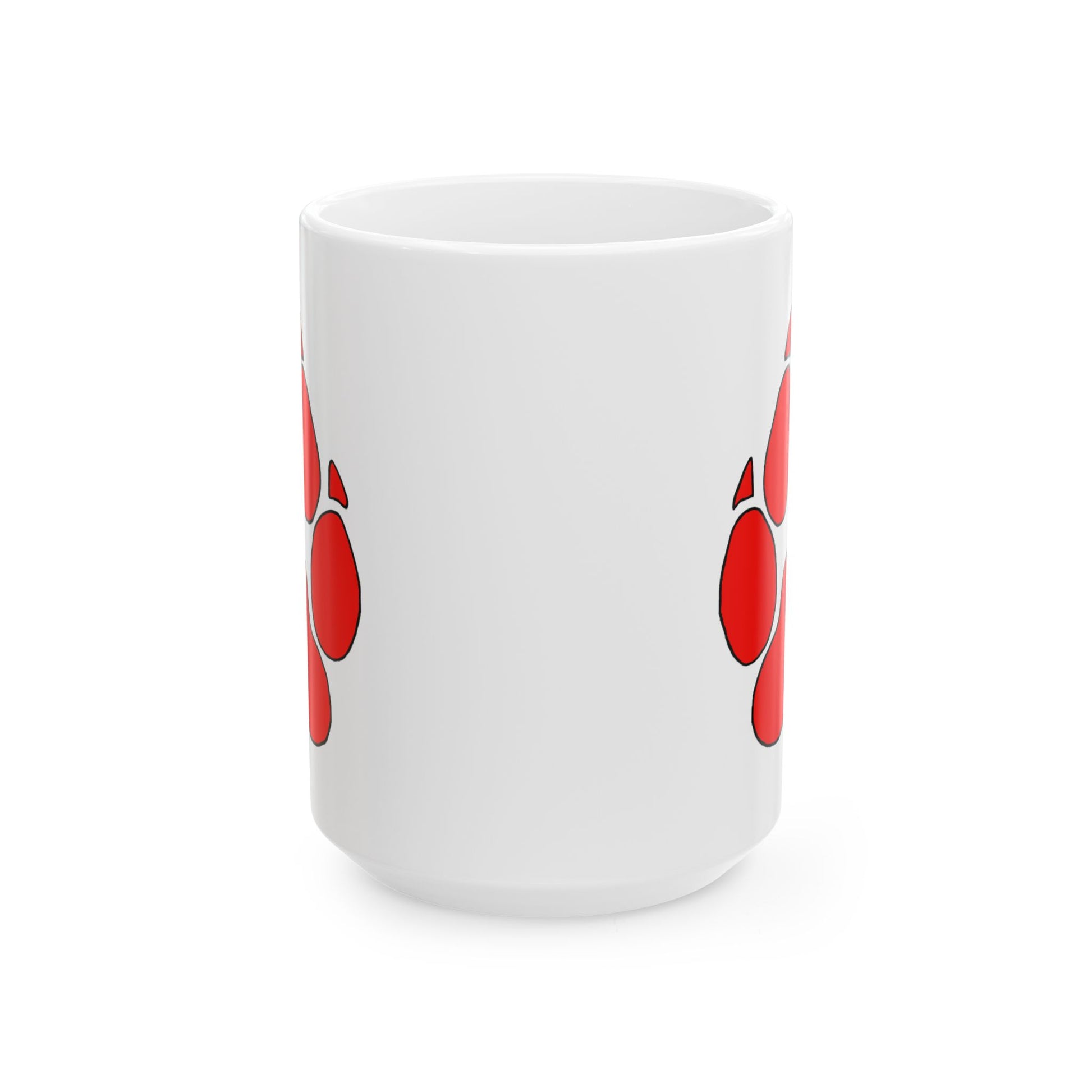 A crisp, glossy ceramic mug that brings a little playful energy to everyday sips. Bright, high-definition printing wraps the white ceramic with bold red paw print that catches the eye from every angle. Lightweight but sturdy, the comfortable C-handle and shiny finish make this mug easy to reach for in the morning or during a late-night work session. Built for daily use — microwave and dishwasher safe, and free from lead and BPA — it feels familiar in the hand while standing out on the shelf. Choose 11oz for a classic coffee portion or 15oz when you need a longer, warmer pause in your day.