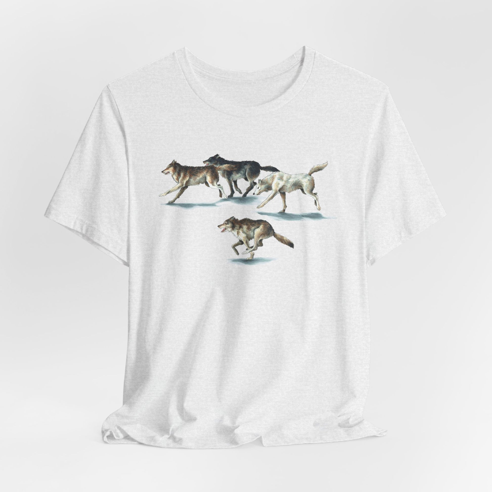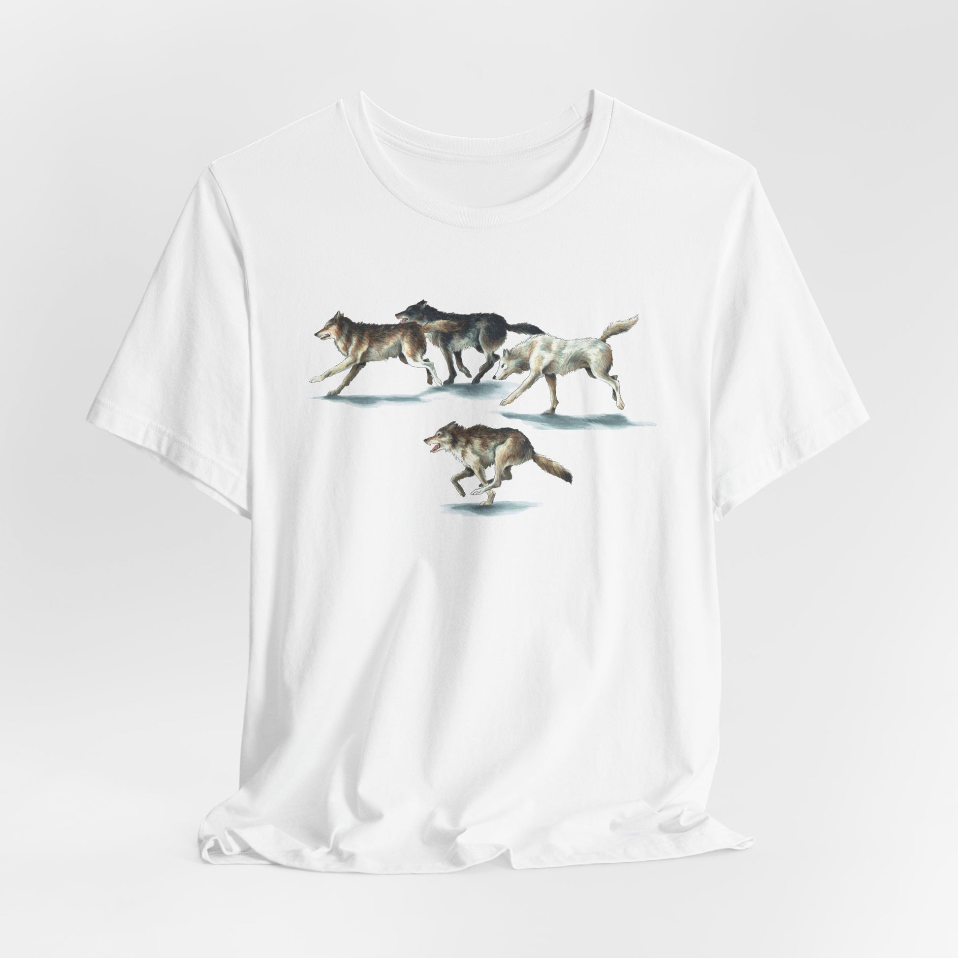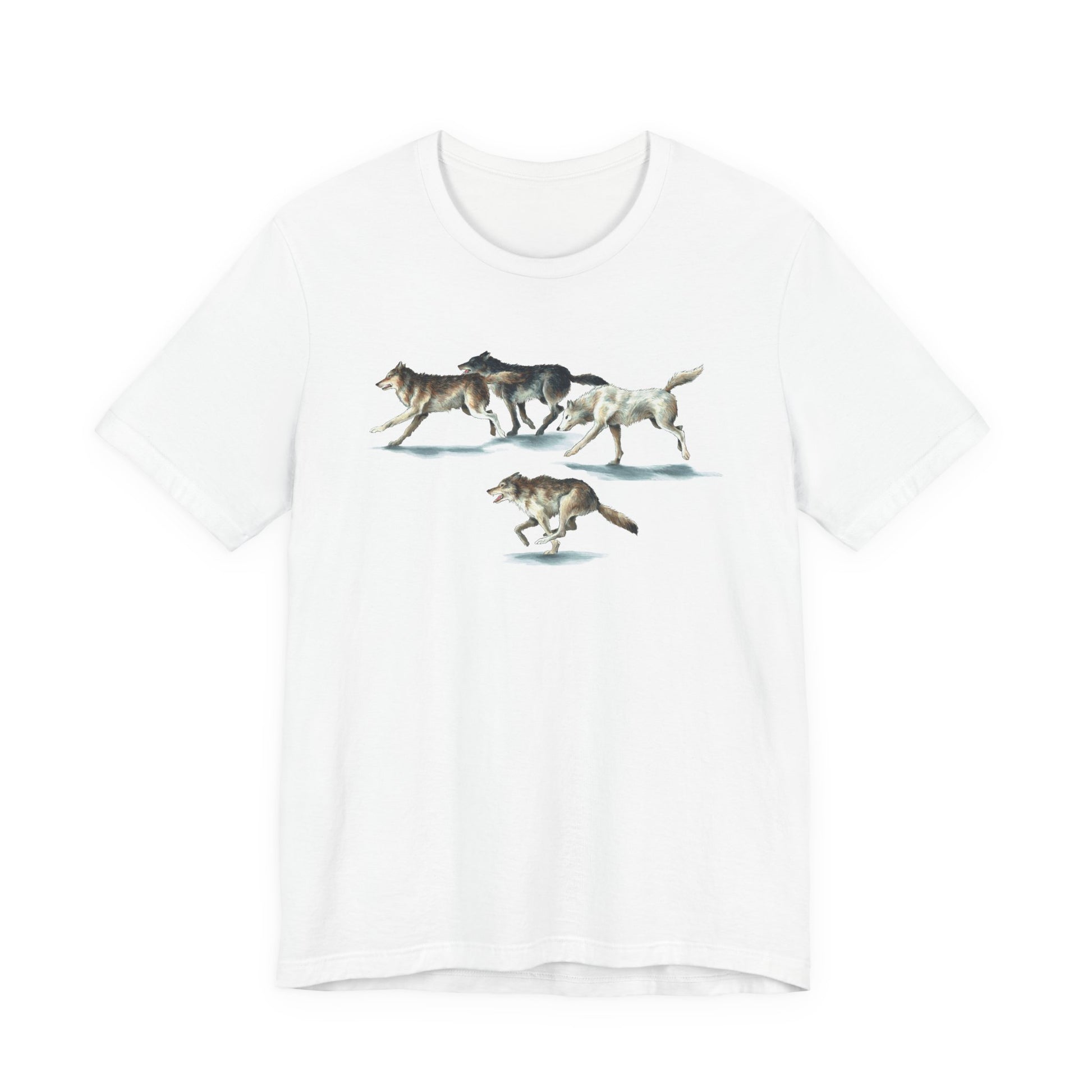 A delicate watercolor of running wolves drifts across the chest, rendered in muted earth tones that let the art breathe on a clean white canvas. The cut sits close to the body without clinging, with a classic crew neckline and neat side seams that hold shape through repeated wear.