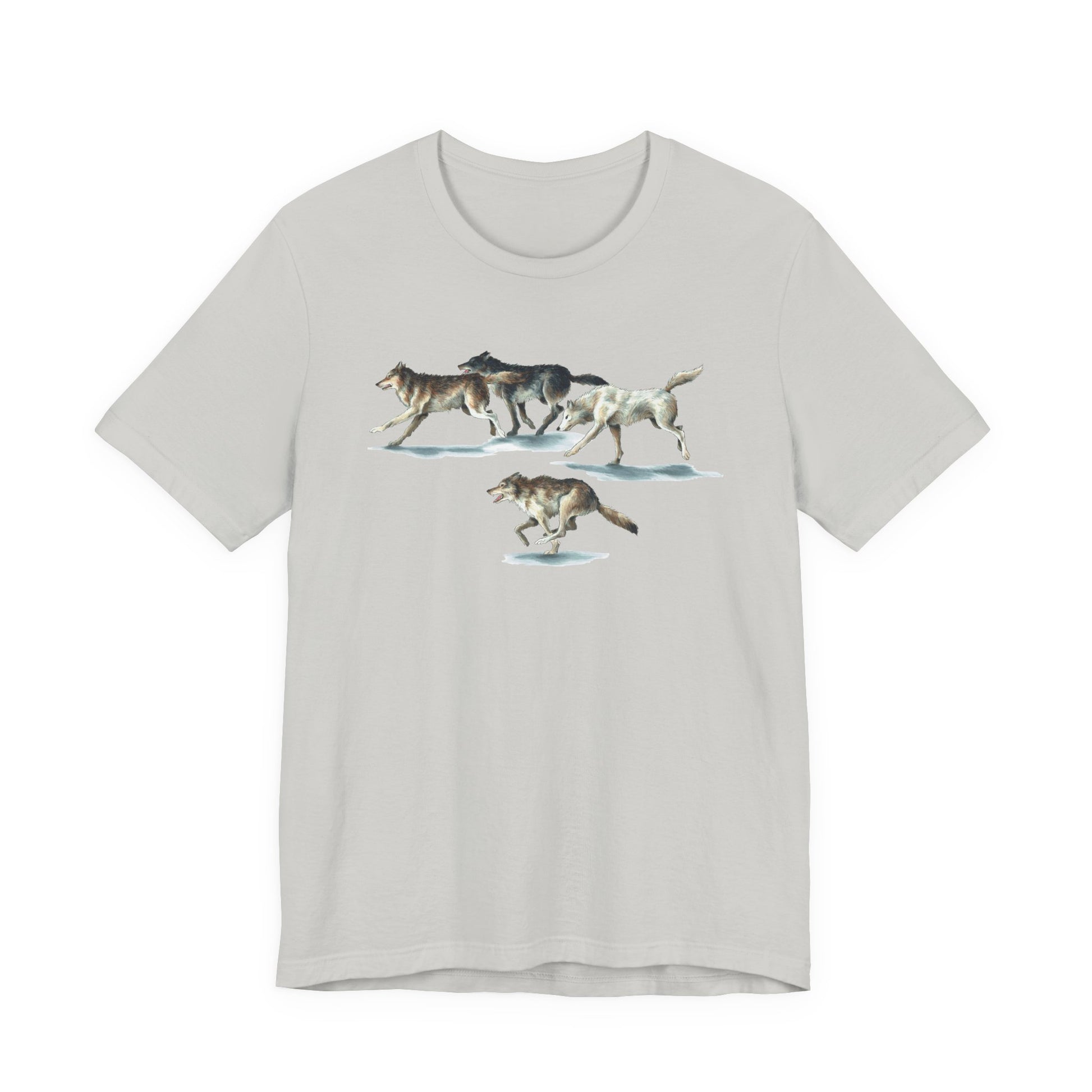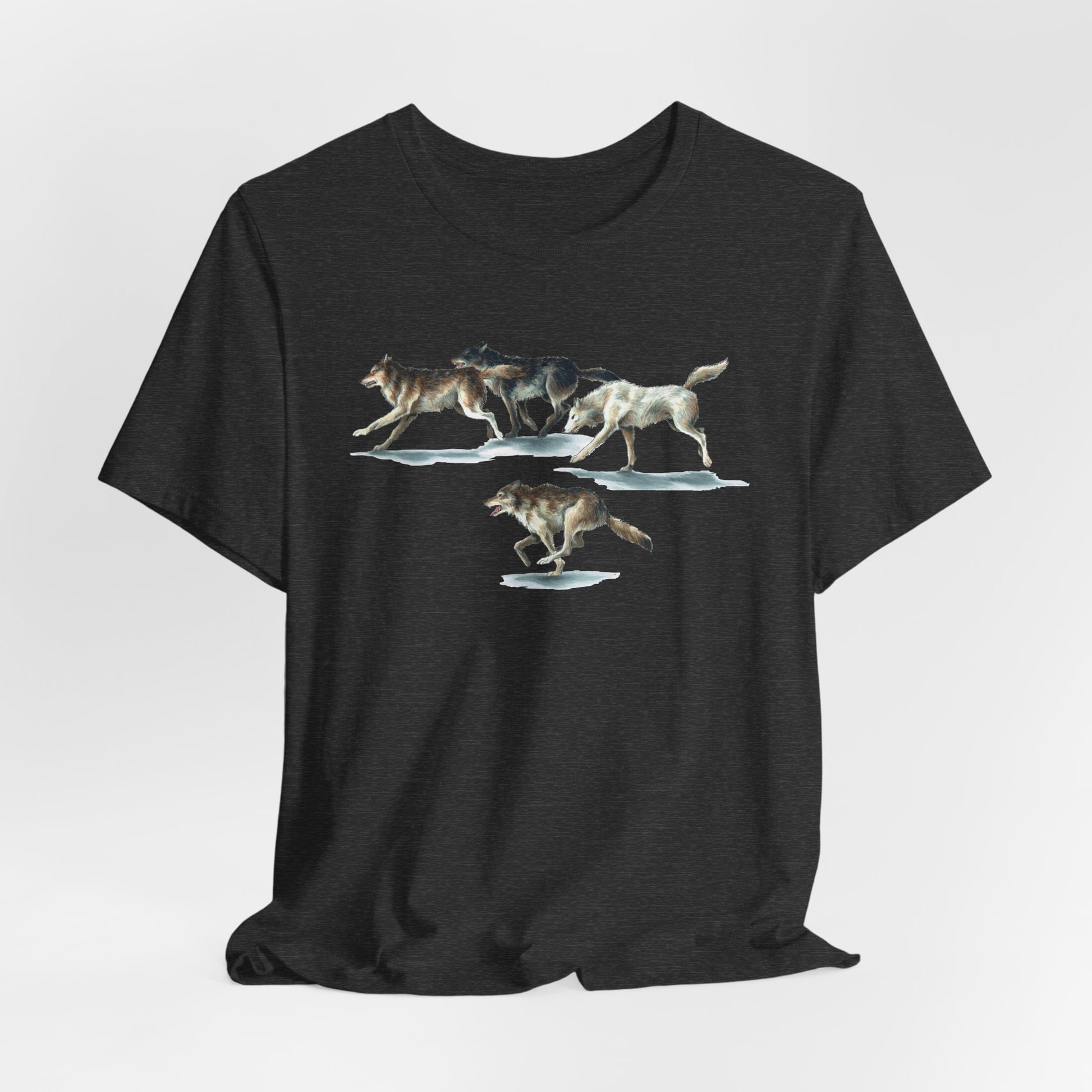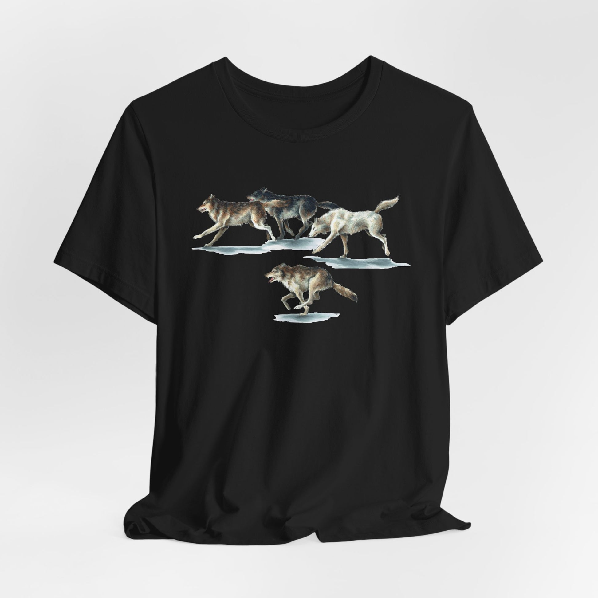 A delicate watercolor of running wolves drifts across the chest, rendered in muted earth tones that let the art breathe on a clean white canvas. The cut sits close to the body without clinging, with a classic crew neckline and neat side seams that hold shape through repeated wear.