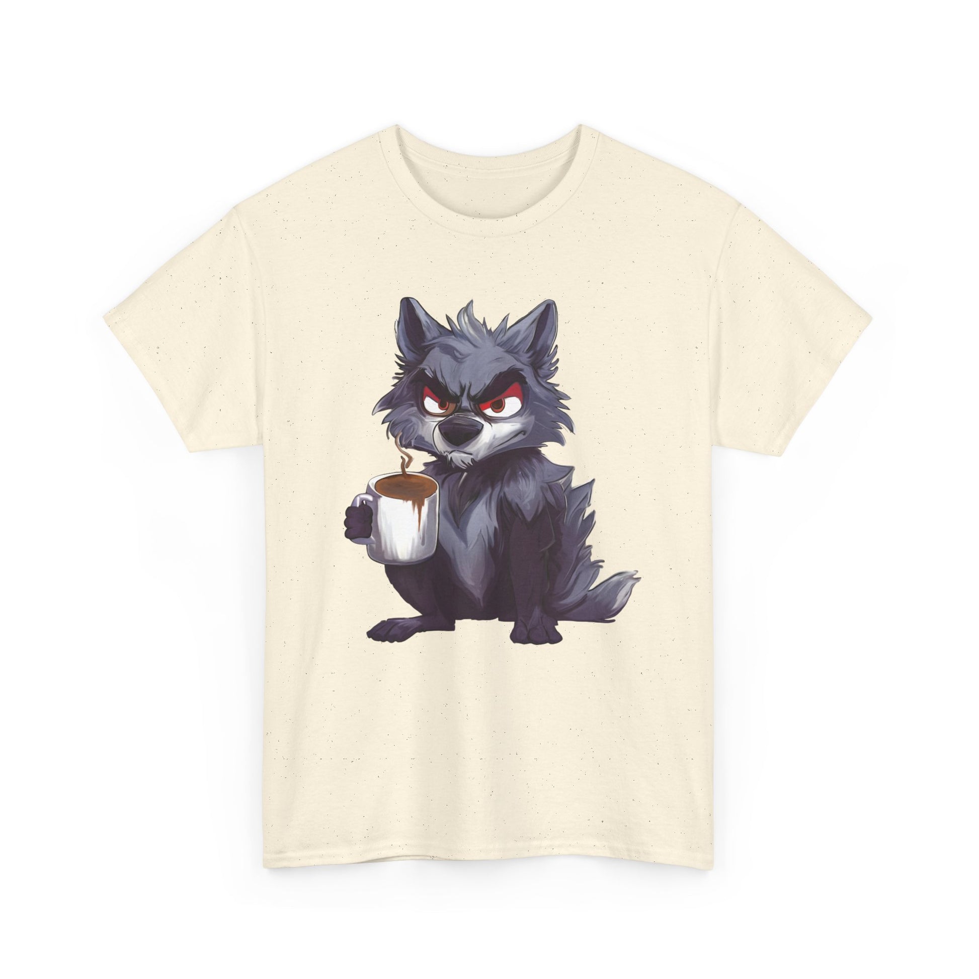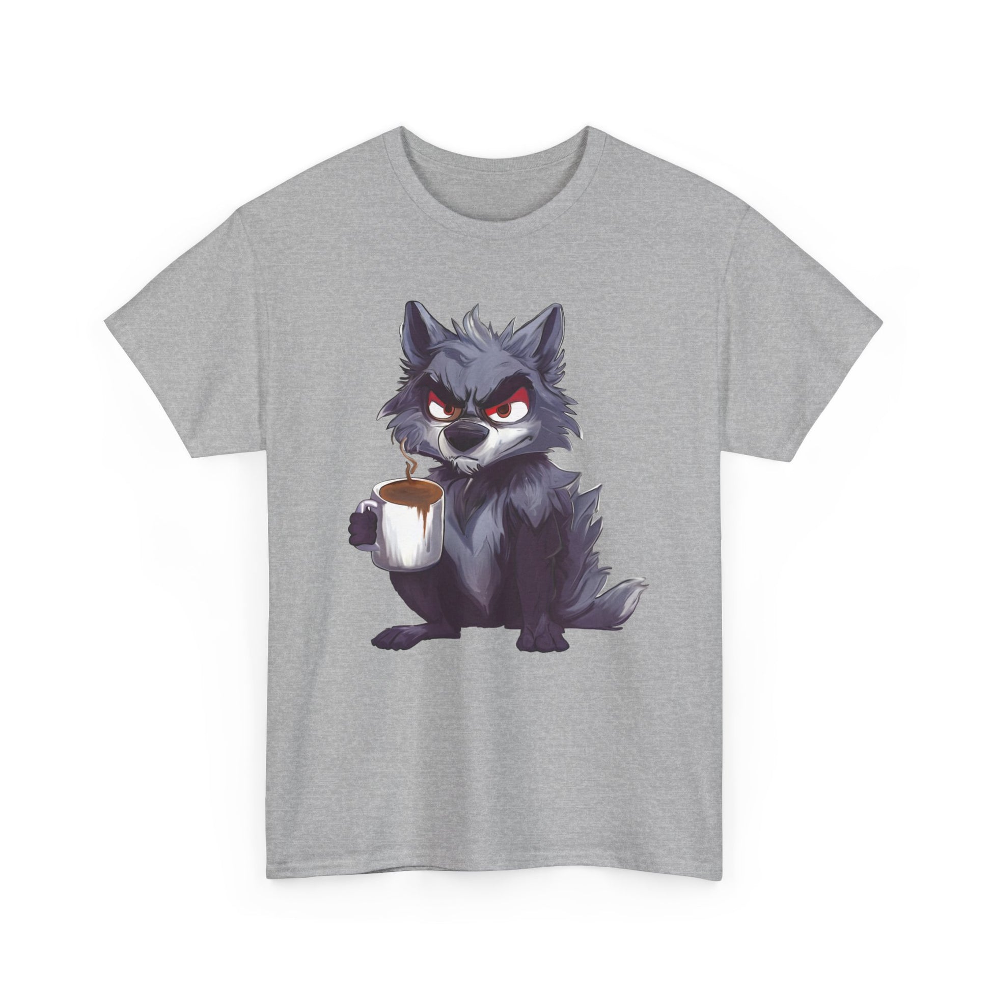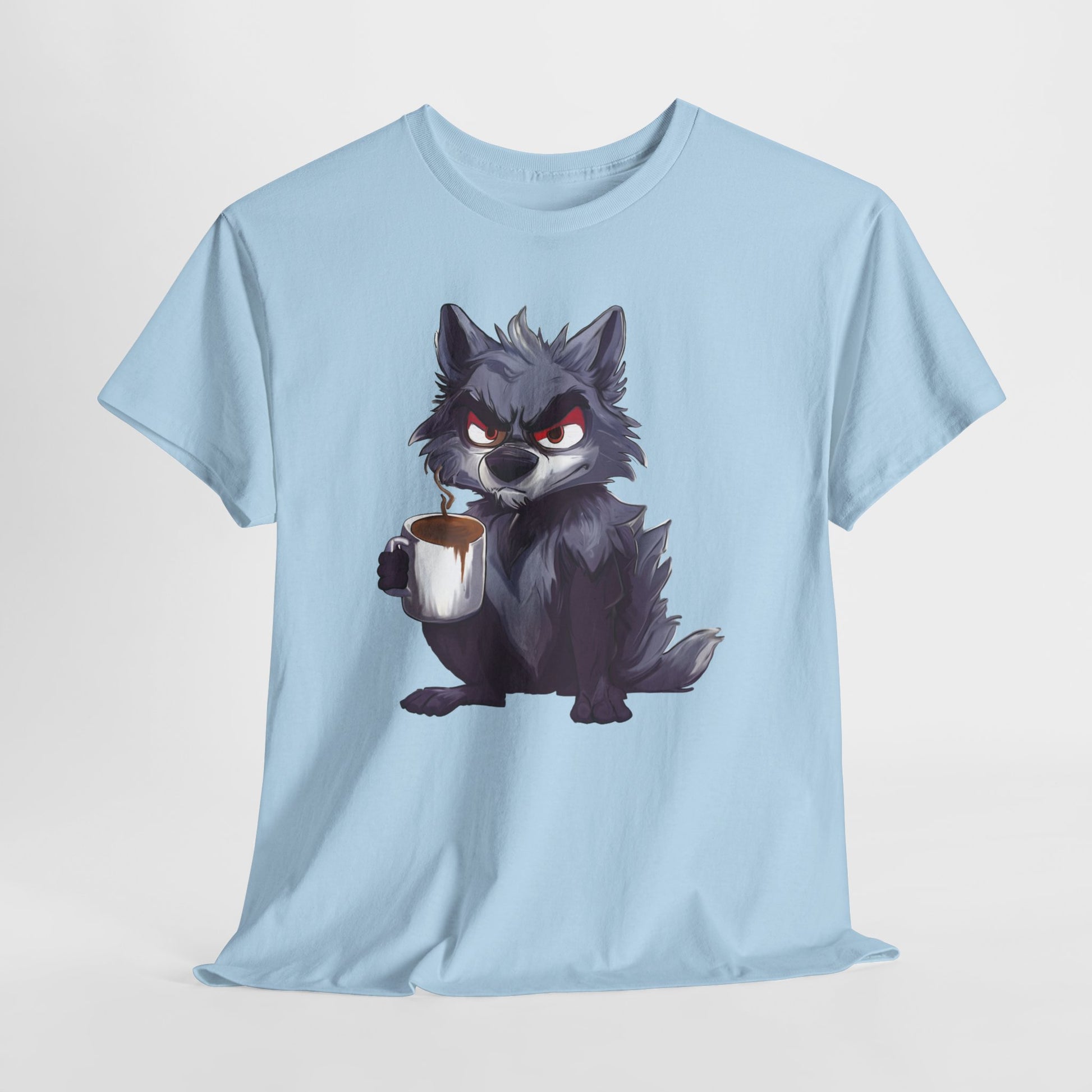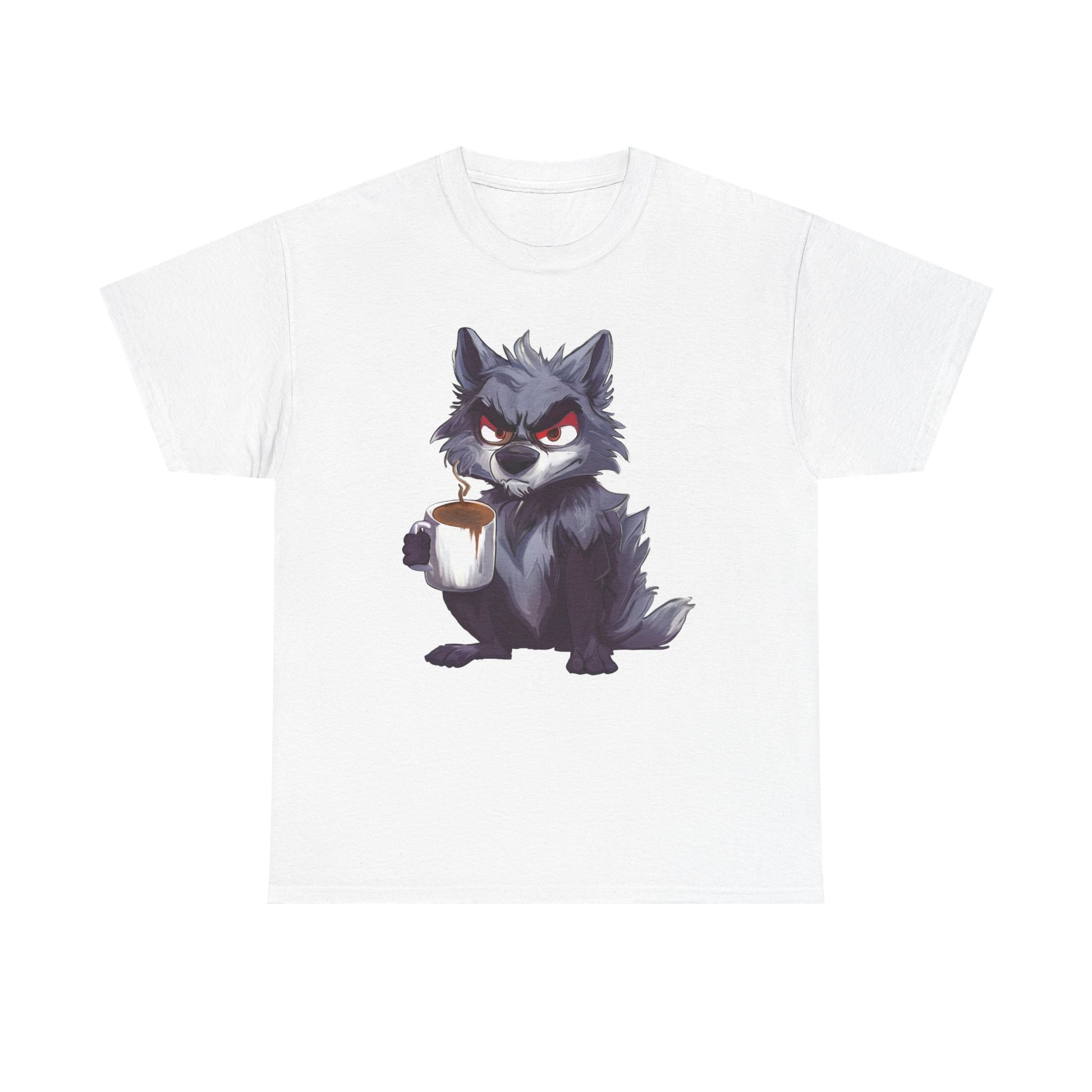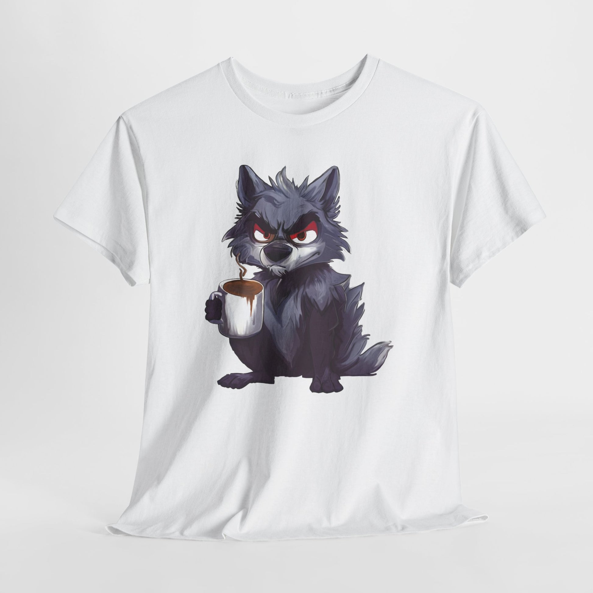 A soft, sturdy, heavy-duty tee that brings a little reality of how you feel in the moment. This classic crew-neck shirt features a bold art print of a cheeky, coffee-holding wolf — equal parts scruffy and adorable — centered on a clean white background. The medium-weight cotton holds prints with crisp detail and resists stretching, while the relaxed, timeless cut layers easily under jackets or stands alone for casual coffee runs, game nights, or late mornings at the studio.