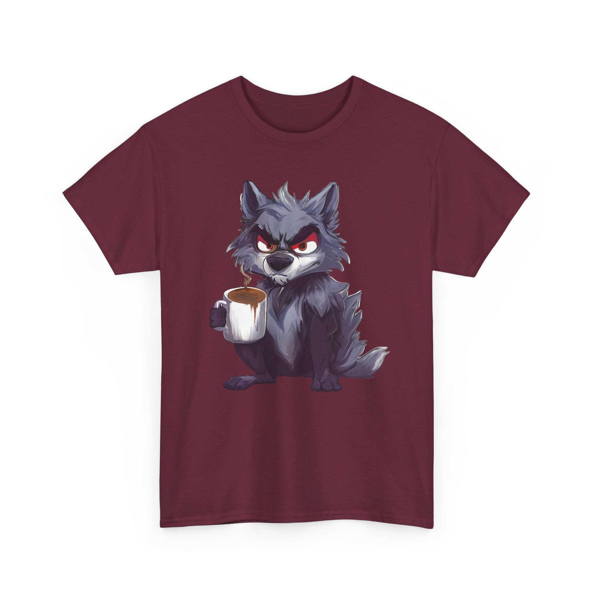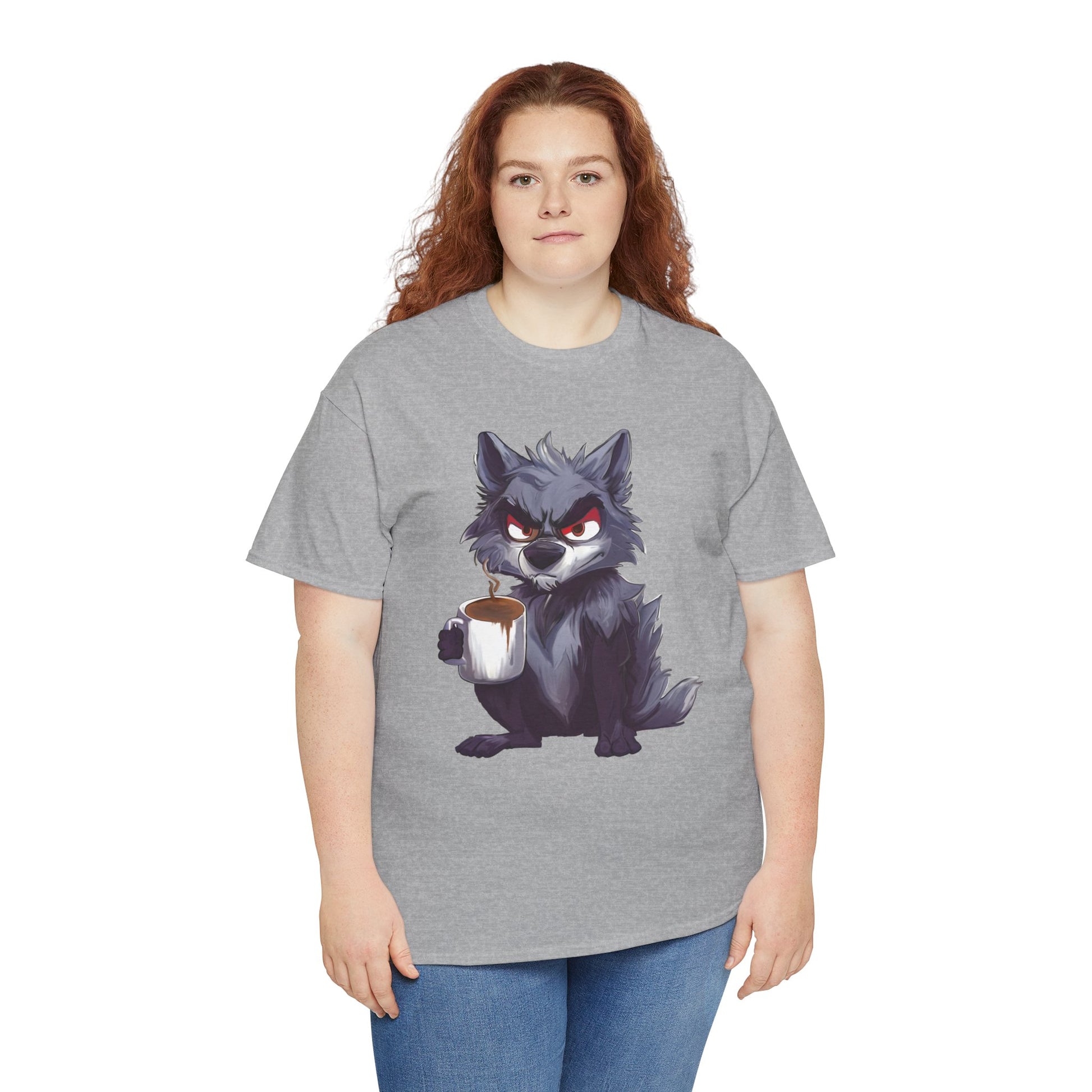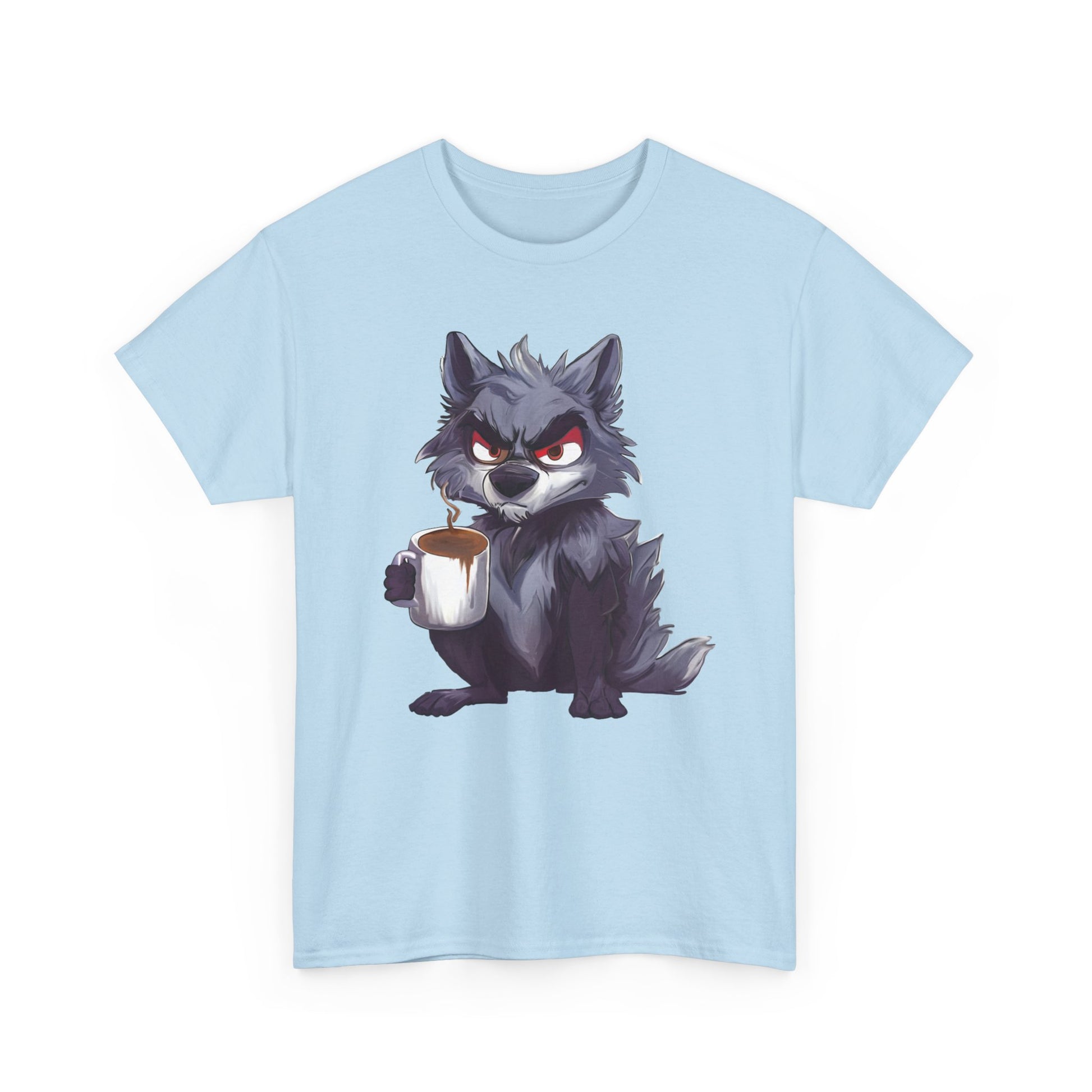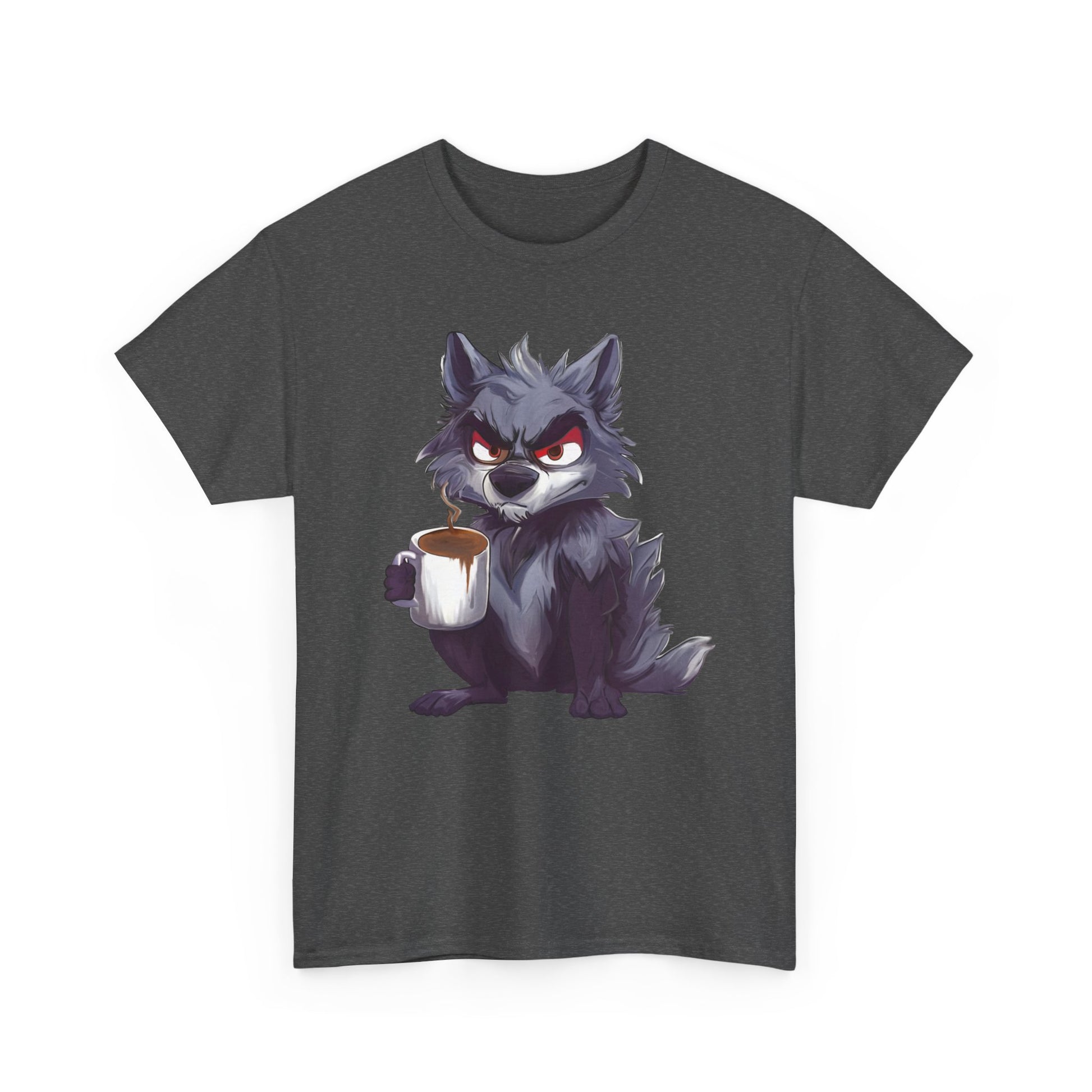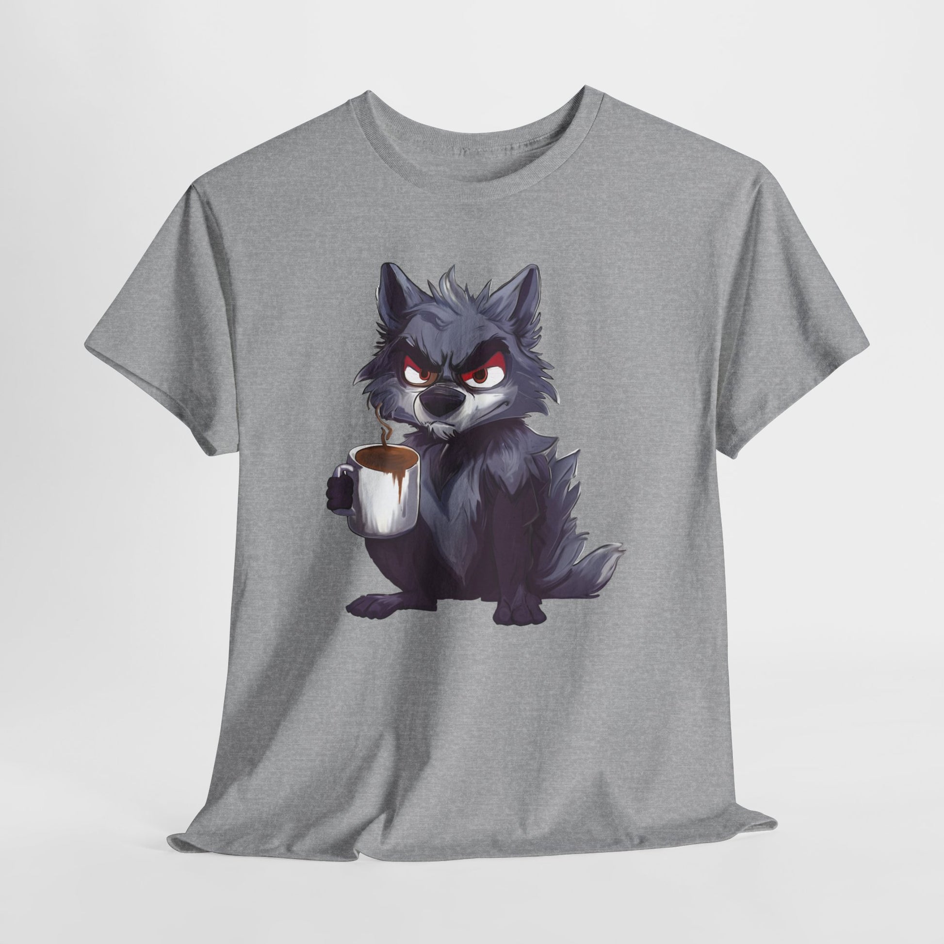 A soft, sturdy, heavy-duty tee that brings a little reality of how you feel in the moment. This classic crew-neck shirt features a bold art print of a cheeky, coffee-holding wolf — equal parts scruffy and adorable — centered on a clean white background. The medium-weight cotton holds prints with crisp detail and resists stretching, while the relaxed, timeless cut layers easily under jackets or stands alone for casual coffee runs, game nights, or late mornings at the studio.